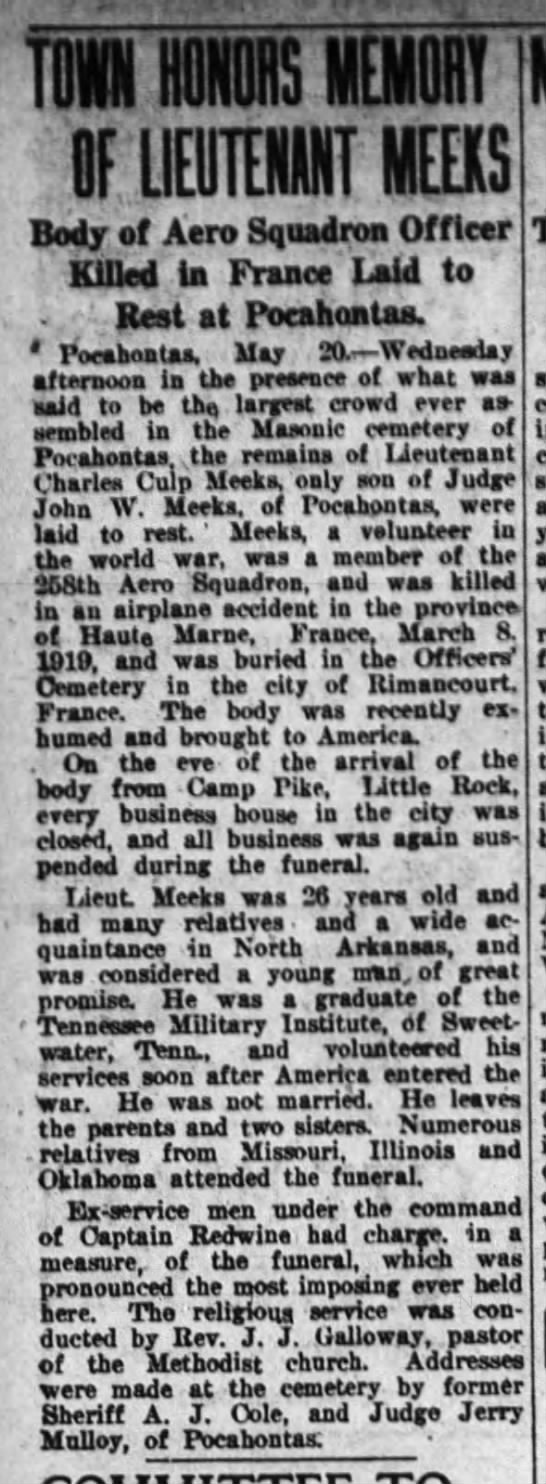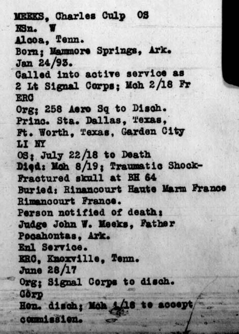 Lt Meeks died 8 March 1919 at Dinteville, France of a traumatic shock, fractured skull at BH 64 after his airplane crashed. He was initially buried at Rimancourt Haute Marm in France. He is buried at Masonic Cemetery, Pocahontas, Randolph County, Arkansas.