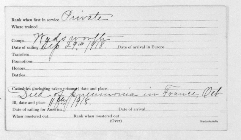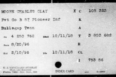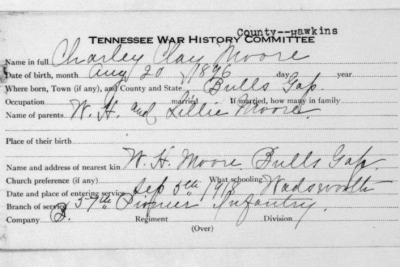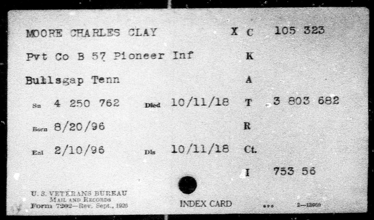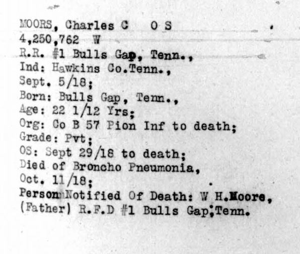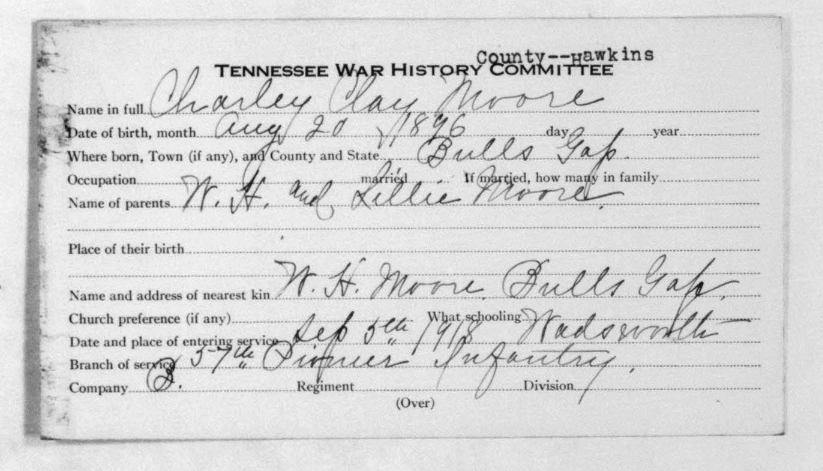 Charles Clay (Charley) Moore was born in Bulls Gap, Tennessee to William Henderson Moore and Lillie Angeline Charles. He trained at Camp Wadsworth and sailed to Europe on September 29, 1918. He died of pneumonia at the age of 22 at Brest in France.