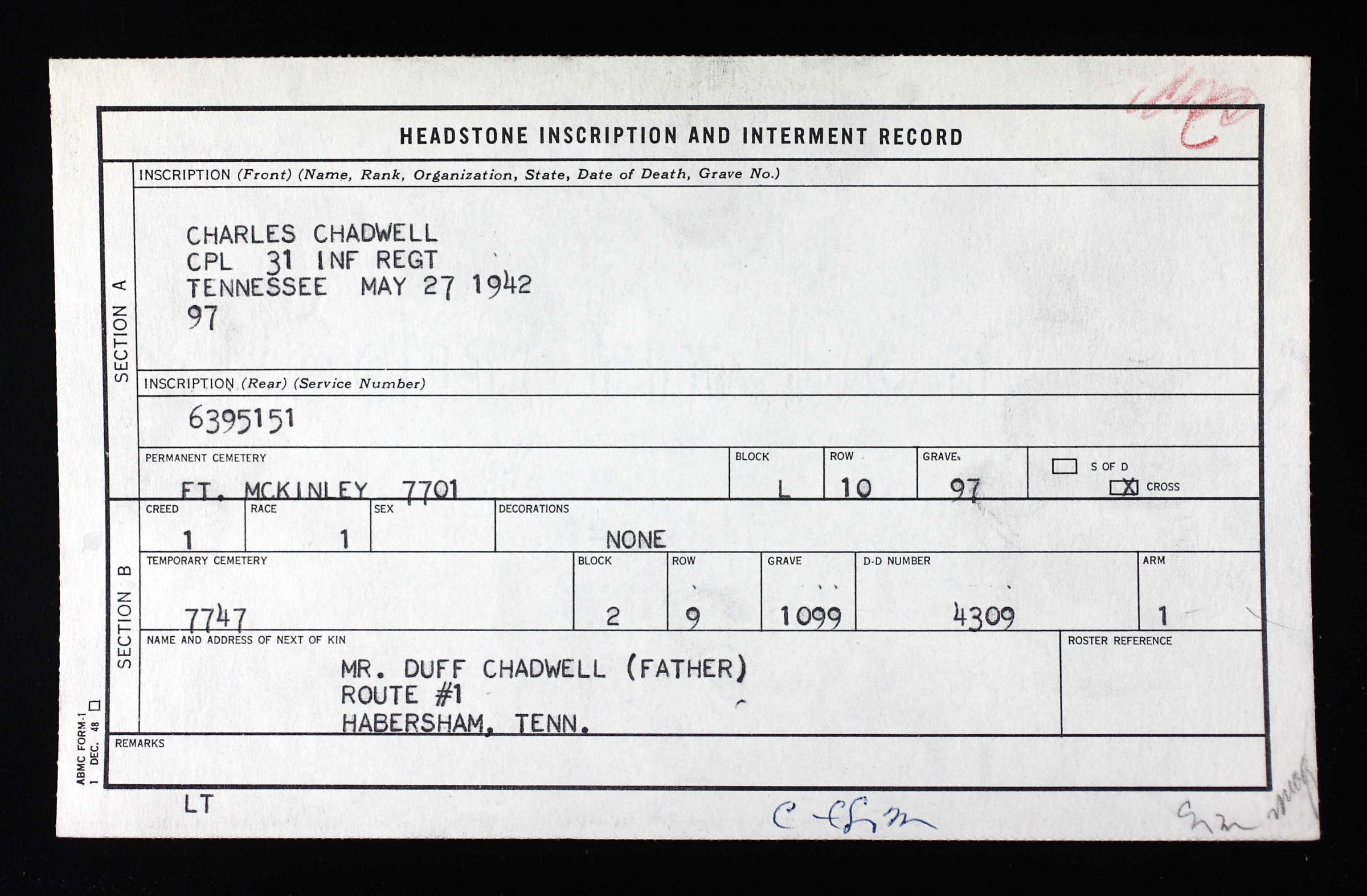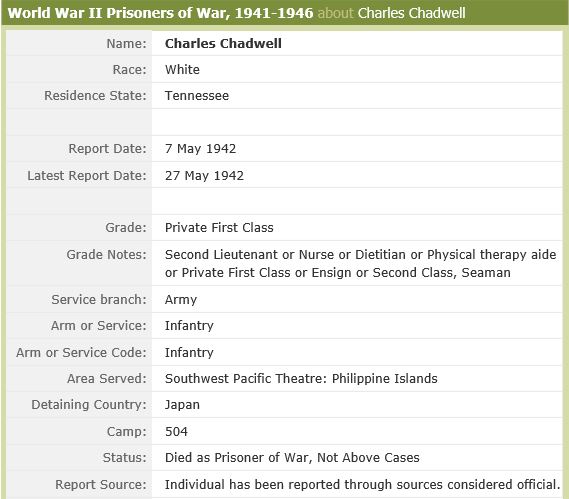Corporal Chadwell was a Prisoner of war at camp 501, PW Camp #4 – O’Donnel Tarlac Luzon Philippines 15-120 and died on the 27th of May 1942. He was interred at the Manila American Cemetery, Philippines, plot L, row 10, grave 97.