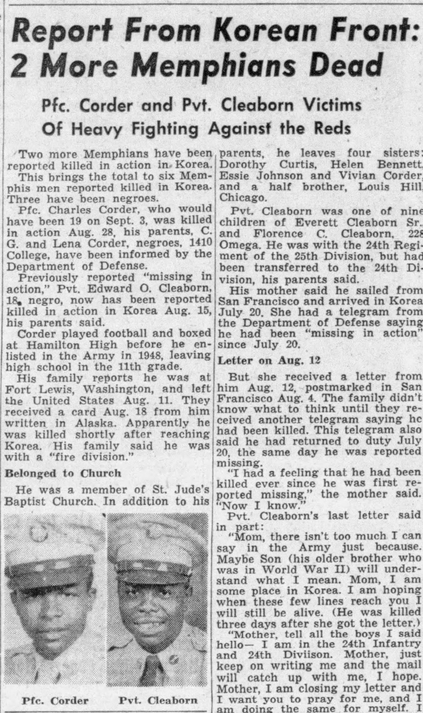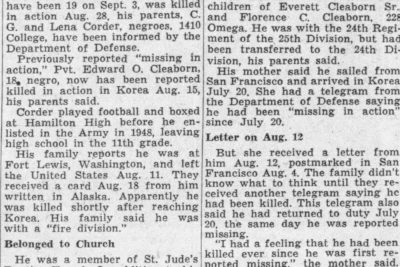 Pfc. Charles Corder, who would have been 19 on Sept. 3, was killed in action Aug. 28, his parents, C.G. and Lena Corder, 1410 College, have been informed by the Department of Defense. Corder played football and boxed at Hamilton High before he enlisted in the Army in 1948, leaving high school in the 11th grade. His family reports he was at Fort Lewis, Washington, and left the United States Aug. 11. They received a card Aug. 18 from him written in Alaska. Apparently he was killed shortly after reaching Korea. His family said he was with a “fire division”. He was a member of St. Jude’s Baptist Church. In addition to his parents, he leaves four sisters: Dorothy Curtis, Helen Bennett, Essie Johnson and Vivian Corder, and a half brother, Louis Hill, Chicago.