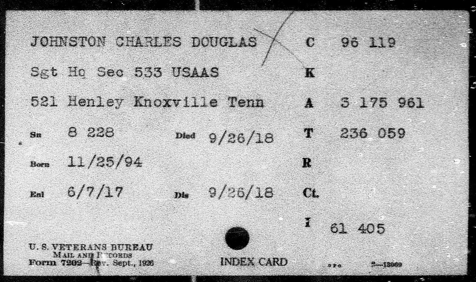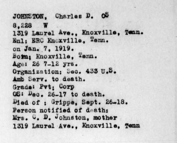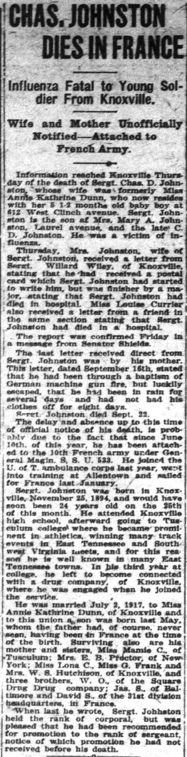 Information reached Knoxville Thursday of the death of Sergt. Chas. D. Johnston, whose wife was formerly Miss Annie Katherine Dunn, who now resides with her 5 1/2 month old baby boy at 612 West Clinch Avenue. Sergt. Johnston is the son of Mrs. Mary A. Johnston, Laurel Avenue, and the late C.D. Johnston. He was a victim of influenza.