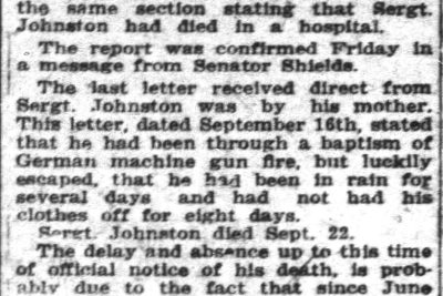Thursday, Mrs. Johnston, wife of Sergt. Johnston, received a letter from Sergt. Willard Wiley, of Knoxville, stating that he had received a postal card which Sergt. Johnston had started to write him, but was finished by a Major, stating that Sergt. Johnston had died in hospital. Miss Louise Currier also received a letter from a friend in the same section stating that Sergt Johnston had died in a hospital.