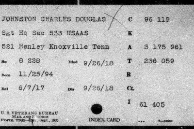 Charles Douglas Johnston Jr. from Knoxville volunteered his services to the U.S. Army on June 7, 1917. As a member of the University of Tennessee Ambulance Unit, he received his military training at Allentown, Pennsylvania. He embarked for France December 25, 1917. As a member of the AEF’s contingent of the Army Ambulance Service , Sergeant Johnston saw service with the 7th, 8th, and 10th French Armies, Sanitary Section Unit No. 533, and was a participant in all battles of his command until his death on September 26, 1918 as a result of influenza.
