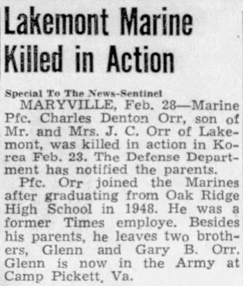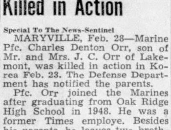 Marine Pfc. Charles Denton Orr, son of Mr. andd Mrs. J.C. Orr of Lakemont, was killed in action in Korea Feb. 23. The Defense Departent has notified the parents. Pfc. Orr joined the Marines after graduating from Oak Ridge High School in 1948. He was a former Times employe. Besides his parents, he leaves two brothers, Glenn and Garry B. Orr. Glenn is now in the Army at Camp Pickett, Va.