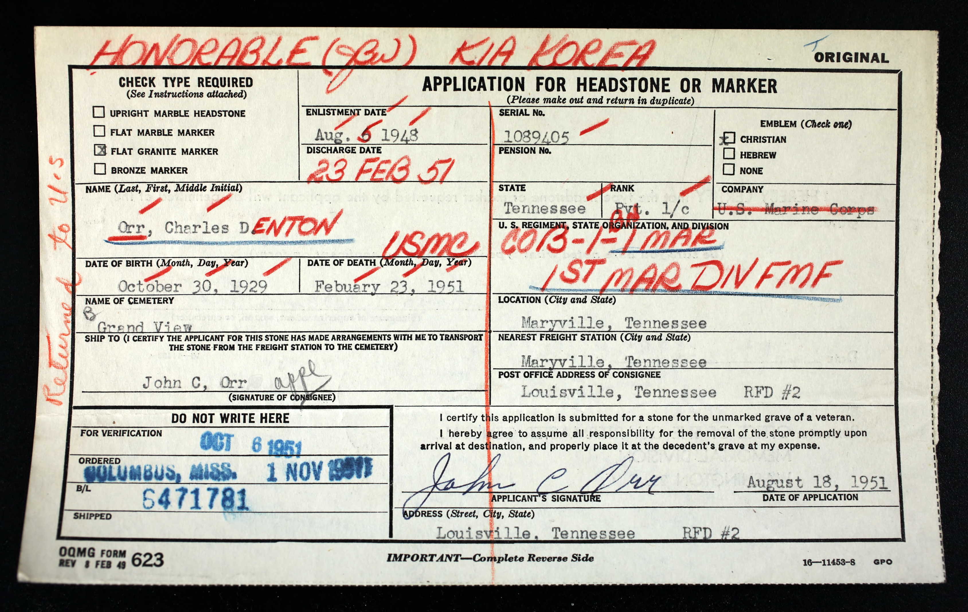 Charles Denton Orr was born in Louisville, Tennessee, on October 3, 1929. He was a member of Company B, 1st Battalion, 1st Marines, 1st Marine Division. He was Killed in Action while fighting the enemy in Korea on February 23, 1951.
