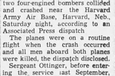 Sgt. Charles D. Ottinger, 20, of 613 Watauga Avenue, was listed among 14 Army men killed when two four-engined bomber collided and crashed near the Harvard Army Air Base, Harvard, Neb., Saturday night, according to an Associated Press dispatch. The planes were on a routine flight when the crash occurred and all men aboard both planes were killed, the dispatch disclosed.