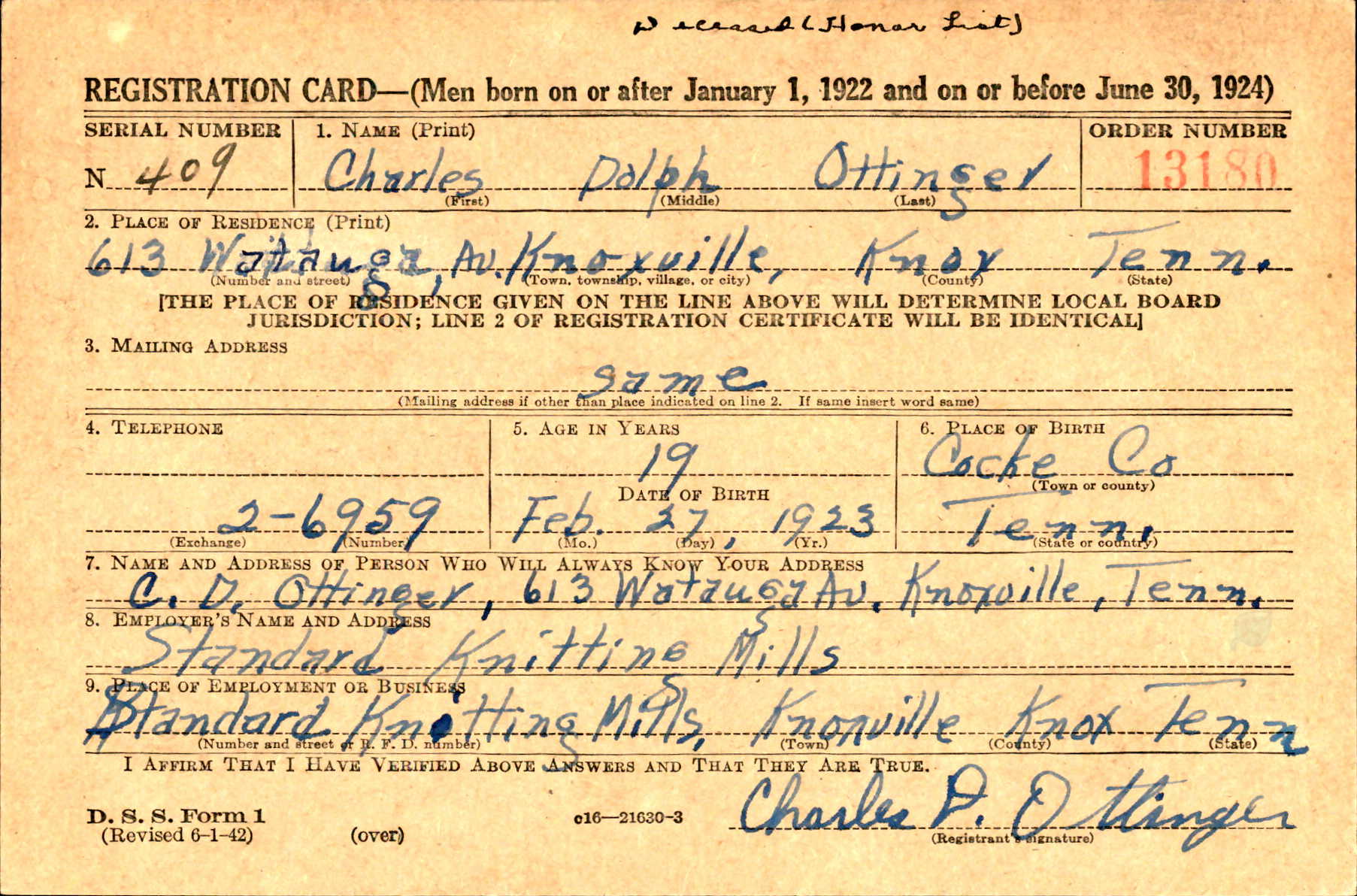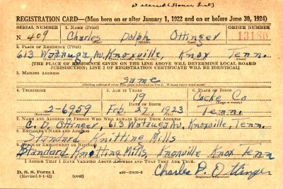 Sergeant Ottinger, before entering the service last September, was employed at the Standard Knitting Mills. Funeral services will be at the Christian Church at Greenville of which Sergeant Ottinger was a member. The date of the funeral will be announced later.