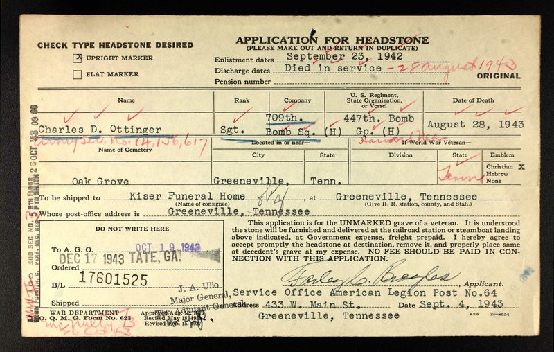 Sgt Ottinger served as a flight engineer of a B-17 flying fortress bomber, who was killed on August 28, 1943 in a mid-air collision involving three bombers during a preparatory to landing at the Harvard, Nebraska Army Airfield. In the late evening, a formation of eight B-17´s were approaching the airfield and were to simulate a peel-off out of formation landing. The pilot of one bomber, who was preparing to land, aborted the landing, pulled upward and collided with another bomber with both airplanes crashing on the airfield. The third bomber, severely damaged, crashed landed in an open field, as the pilot was unable to avoid the wreckage and debris of the two bombers that had collided in mid-air. Thirteen airmen were killed from the mid-air collision, two crewman from the 3rd bomber parachuted to safety and one died while attempting a parachute jump.