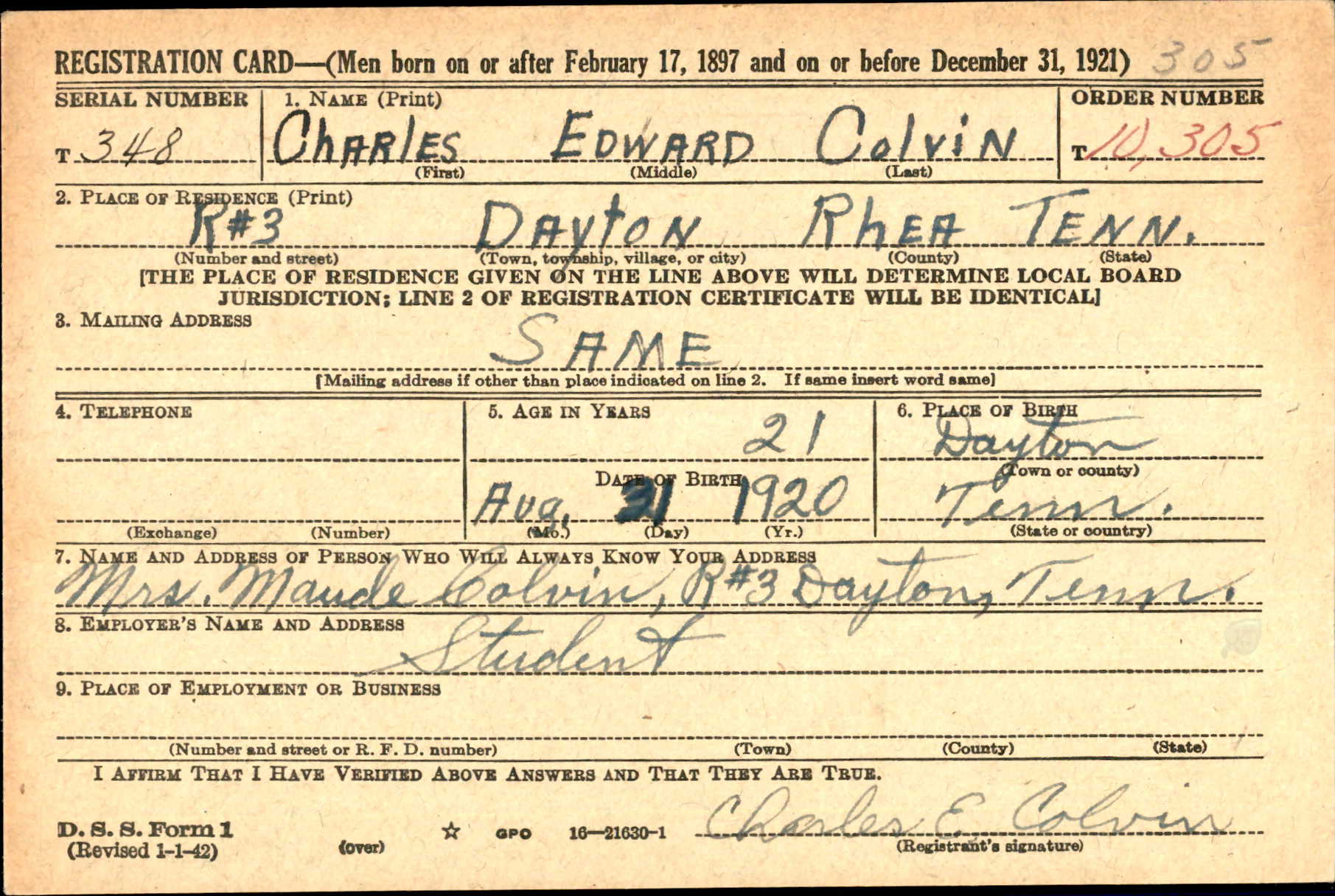 Charles Edward Colvin was born in Dayton, Tennessee, son of Wayne Colvin and Maude Rice.
