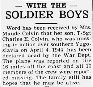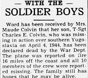 Word has been received by Mrs. Maude Colvin that her son, T-Sgt Charles E. Colvin, who was missing in action over southern Yugoslavia on April 4, 1944, has been declared dead by the War Department. The plane was reported on fire 16 miles off the coast and all 10 members of the crew were reported missing. The family still has hopes that he may be alive.