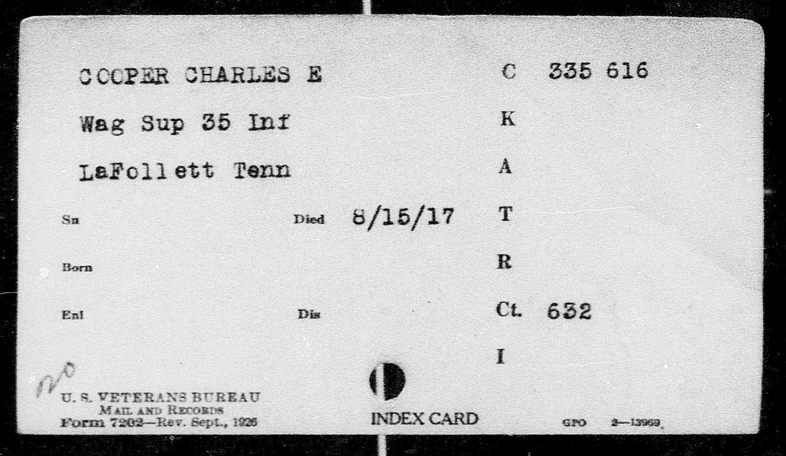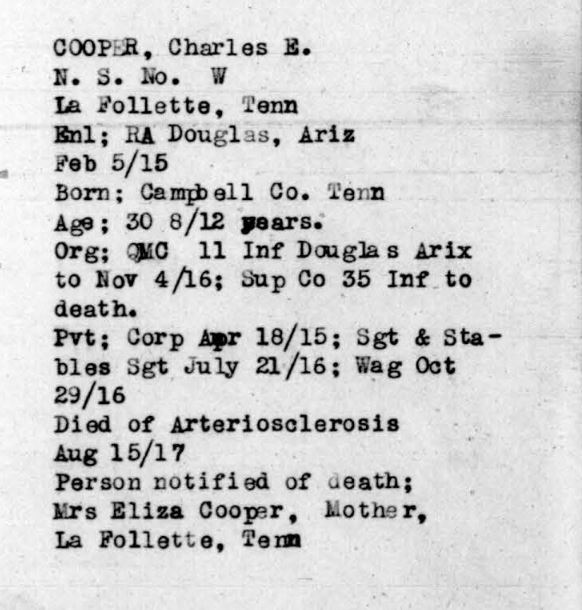 Charles Elliott Cooper was from LaFollette, TN, son of Calvin Kenney Cooper and Eliza H. Dorsett. He enlisted at Douglas in Arizona on 5 February 1915. He died of arteriosclerosis on August 15, 1917 and is buried at Fincastle, Campbell County, TN.