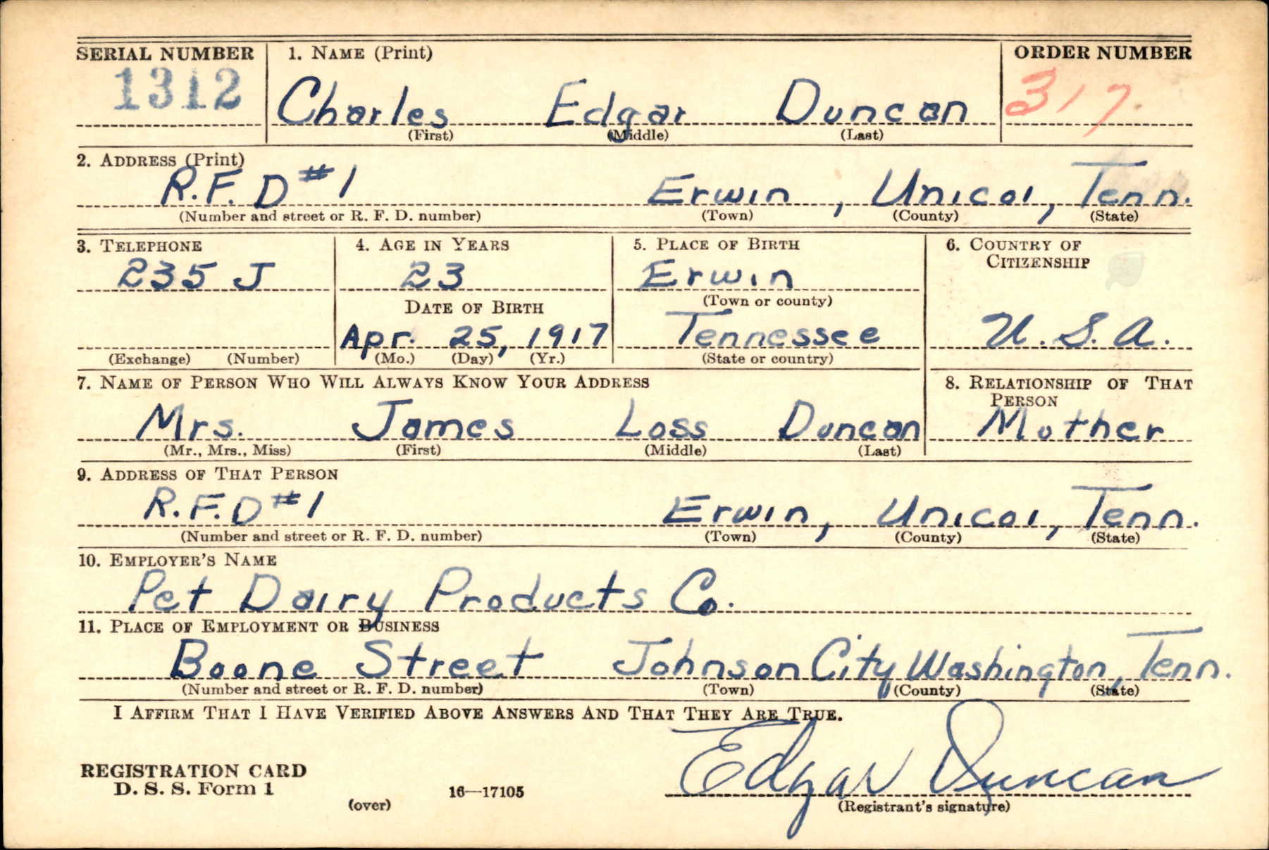 Charles Edgar Duncan was born in Erwin, Tennessee too James Loss Duncan and Creola Bean.