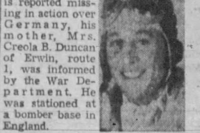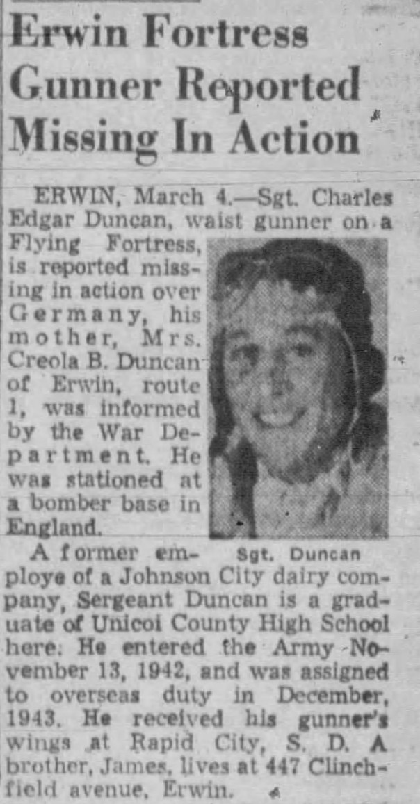 Sgt. Charles Edgar Duncan, waist gunner on a Flying Fortress, is reported missing in action over Germany, his mother, Mrs. Creola B. Duncan, route 1, was informed by the War Department. He was stationed at a bomber base in England. A former employe of a Johnson City dairy company, Sergeant Duncan is a graduate of Unicoi County High School here. He entered the Army November 13, 1942, and was assigned to overseas duty in December, 1943. He received his gunner’s wings at Rapid City, S.D. A brother, James, lives at 447 Clinchfield avenue, Erwin.