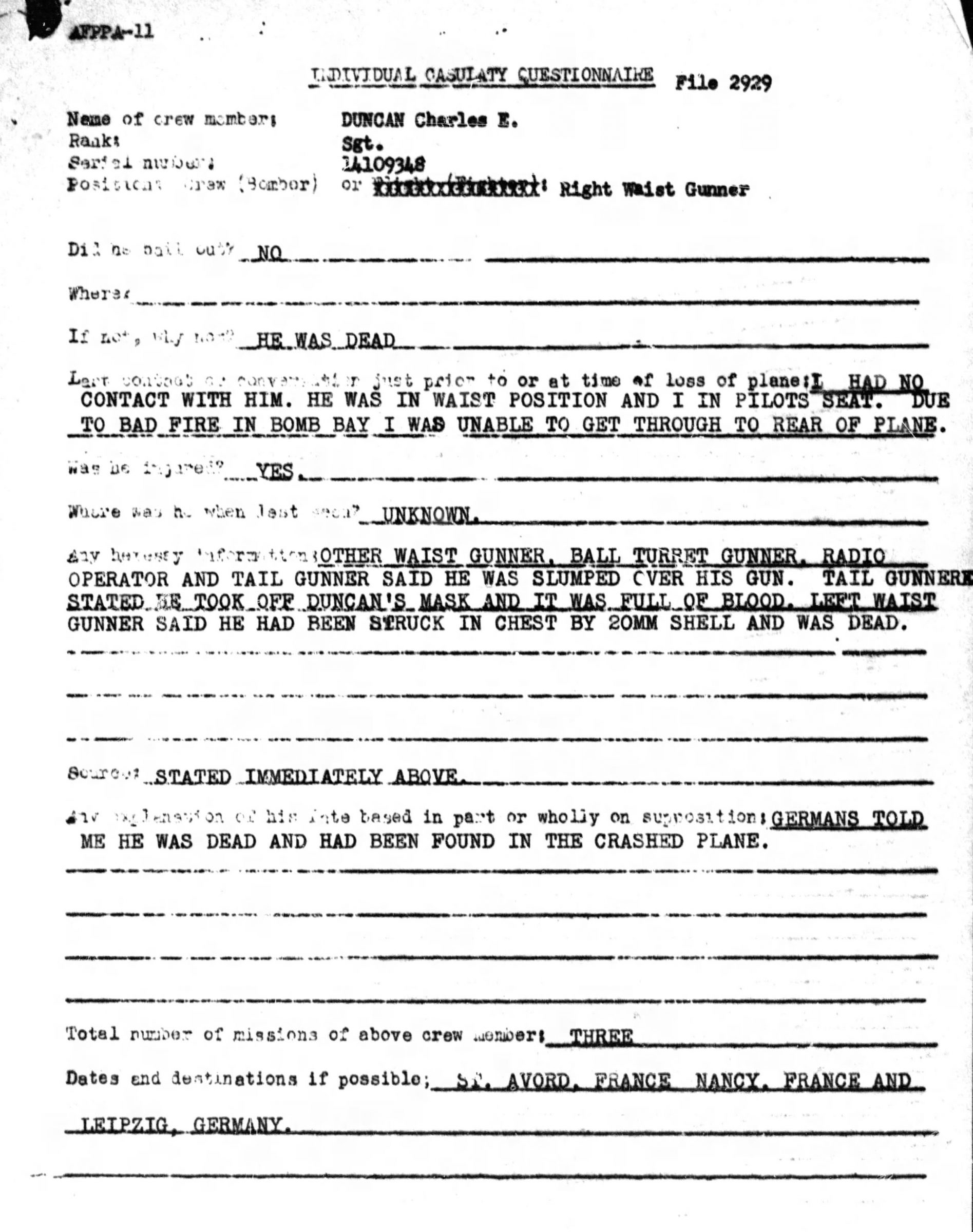 Aircraft B-17G with serial number 42-3562 departed from Ridgewell, England on a day bombing mission to Oschersleben in Germany. The aircraft was hit by flak and enemy fighters and left the formation over the target. Sgt Duncan didn’t bail out. He was struck in the chest by enemy cannon fire and was last seen by the radio operator, slumped over his gun, bleeding profusely from chest and mouth. The radio operator believed that Sgt Duncan was dead and did not attempt to remove him from the aircraft. The remains of Sgt Duncan were found in the crashed airplane.