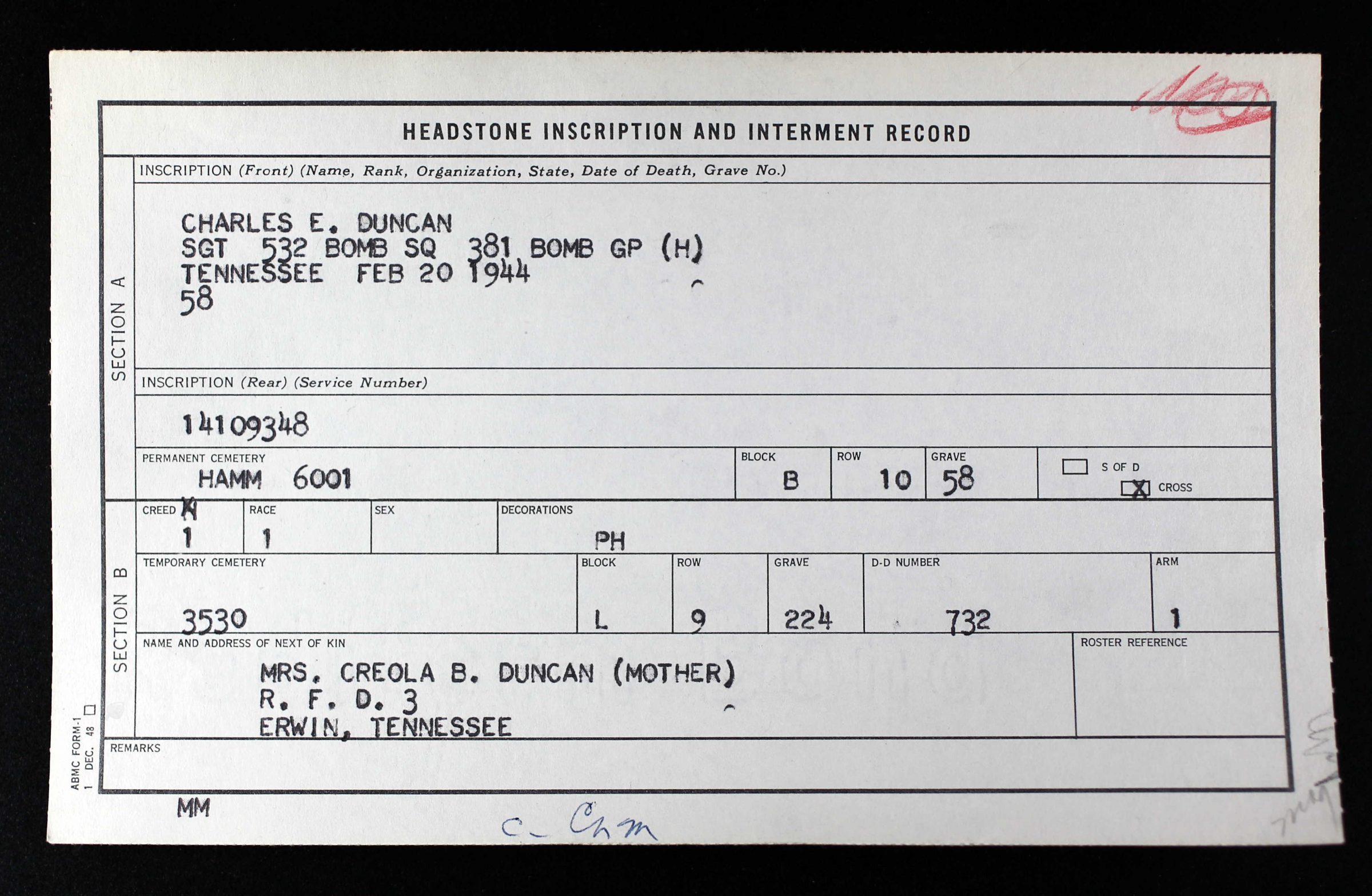 Sergeant Charles E. Duncan, US Army Air Forces, was assigned to the 532nd Bombardment Squadron, 381st Bomber Group, Heavy, flying a B-17 out of Ridgewell, England, during the air offensive in Europe.