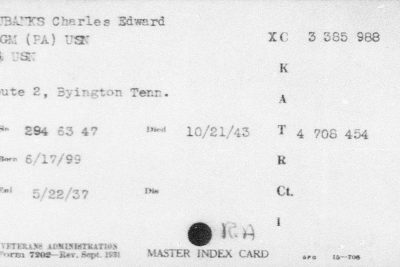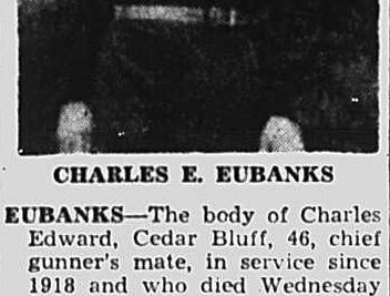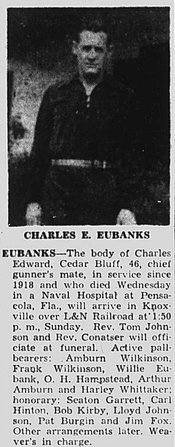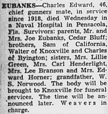 Charles Edward Eubanks, 46, chief gunners mate in service since 1918, died Wednesday in a Naval Hospital in Pensacola, Fla. Survivors: parents, Mr. and Mrs. Joe Eubanks, Cedar Bluff; brothers, Sam of California, Walter of Knoxville and Charles of Byington; sisters, Mrs. Lillie Green, Mrs. Carl Henderlight, Mrs. Lee Branson and Mrs. Edward Horner; grandfather, W.S. Norwood. The body will be brought to Knoxville for funeral services.