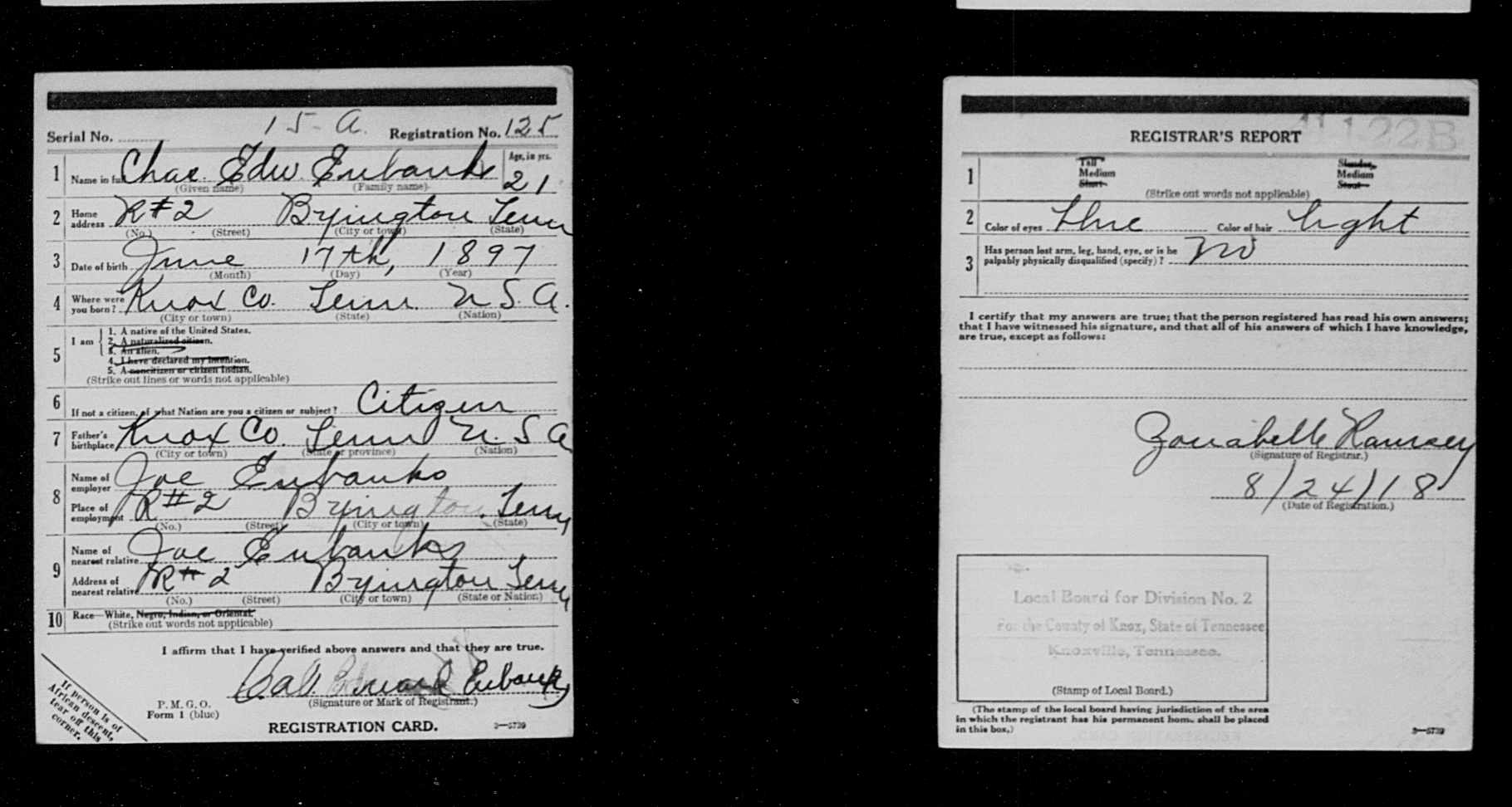 Charles Edward Eubanks was born 17 June 1898 to Joseph S. Eubanks and Venie Lucinda Norwood. He entered the service in 1918 and again in 1937. He died non battle on 21 October 1943