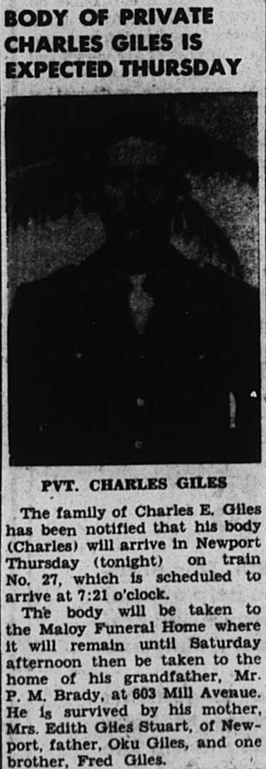 The family of Charles E. Giles has been notified that his body (Charles) will arrive in Newport Thursday (tonight) on train No. 27, which is scheduled to arrive at 7:21 o’clock.