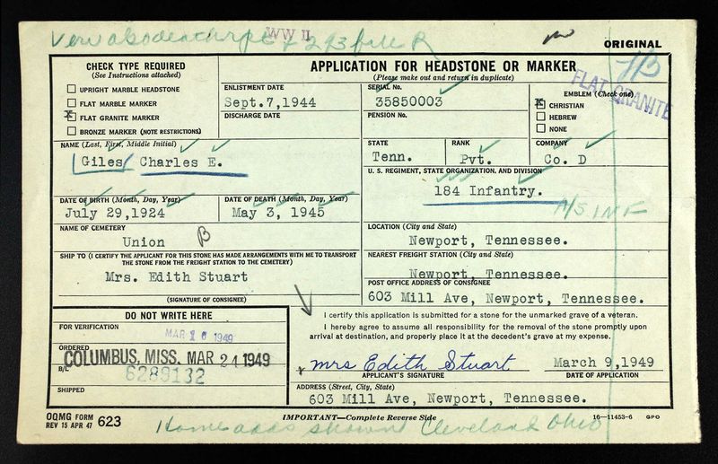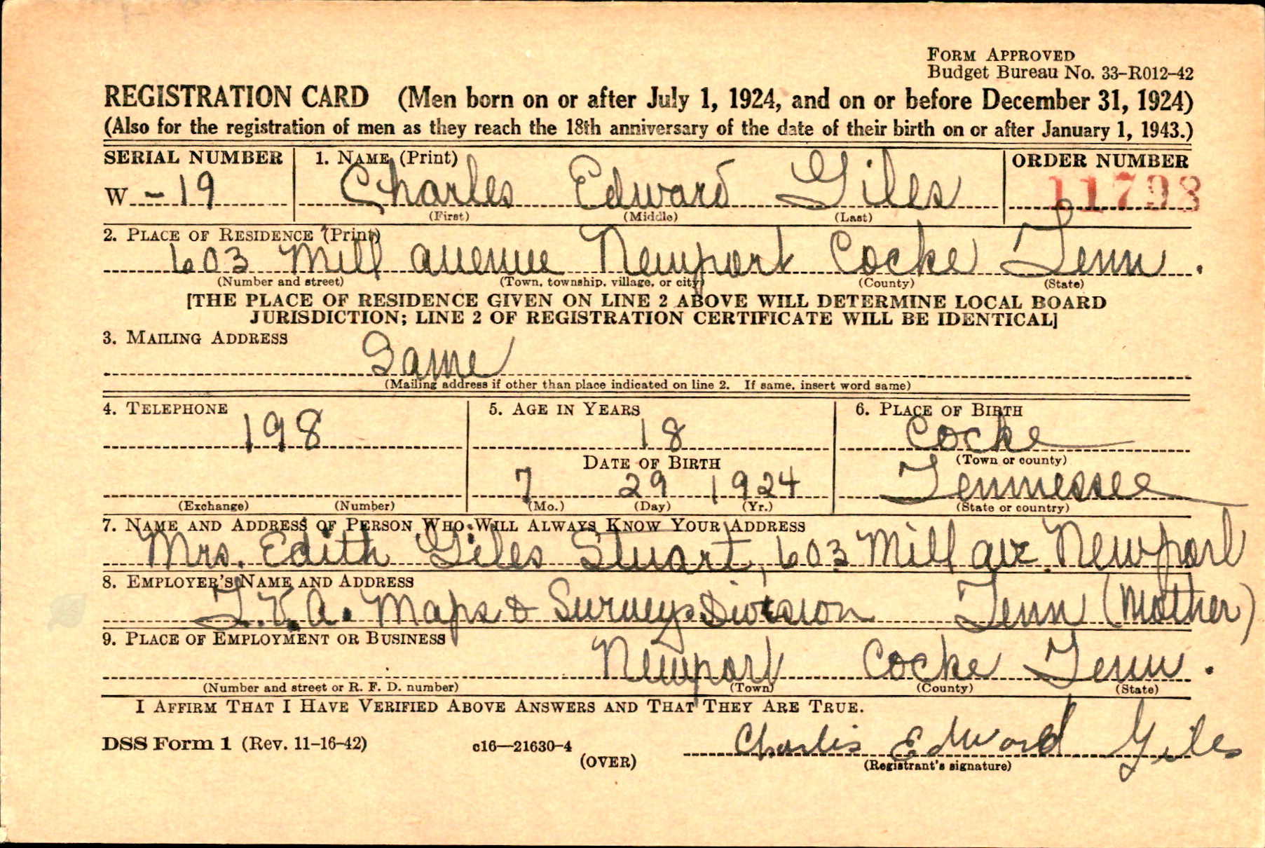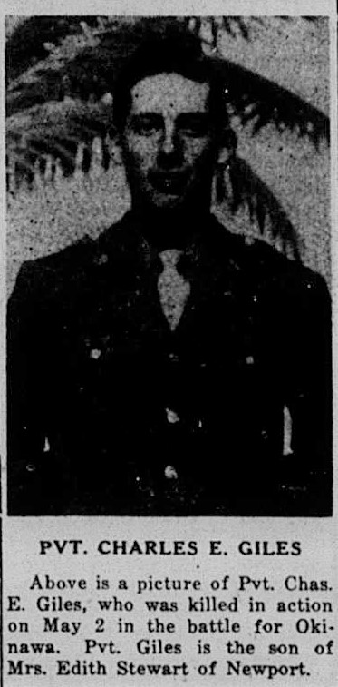 Pvt. Giles was inducted into the armed service September 7, 1944, from Cleveland, Ohio, where he was employed in a defense plant. After receiving the regular army basic traning at Camp Blanding, Fla, he was assigned to overseas duty in the Pacific with the 7th Infantry Division. Pvt. Giles died of wounds received in action on Okinawa May 3, 1945