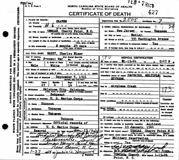 Charles Elmer Haney was born on 5 September 1916 in Oklahoma City, Oklahoma to Senter Haney and Willie Irene McAffrey. He had one sister, Louise Haney. At the time of his death he resided in Nutley, New Jersey. He died of his injuries as a result of a plane crash at USMCAS, Cherry Point in Craven County, North Carolina. He was interred in the Andrew Johnson National Cemetery, Greeneville, Greeneville County, Tennessee, Section C, Grave no. 111. His father was interred on the same date in Section C, Grave 112.