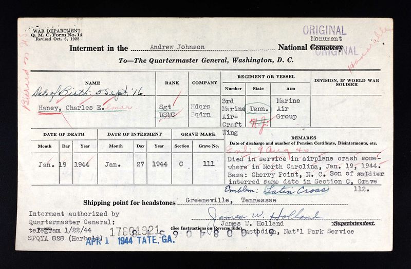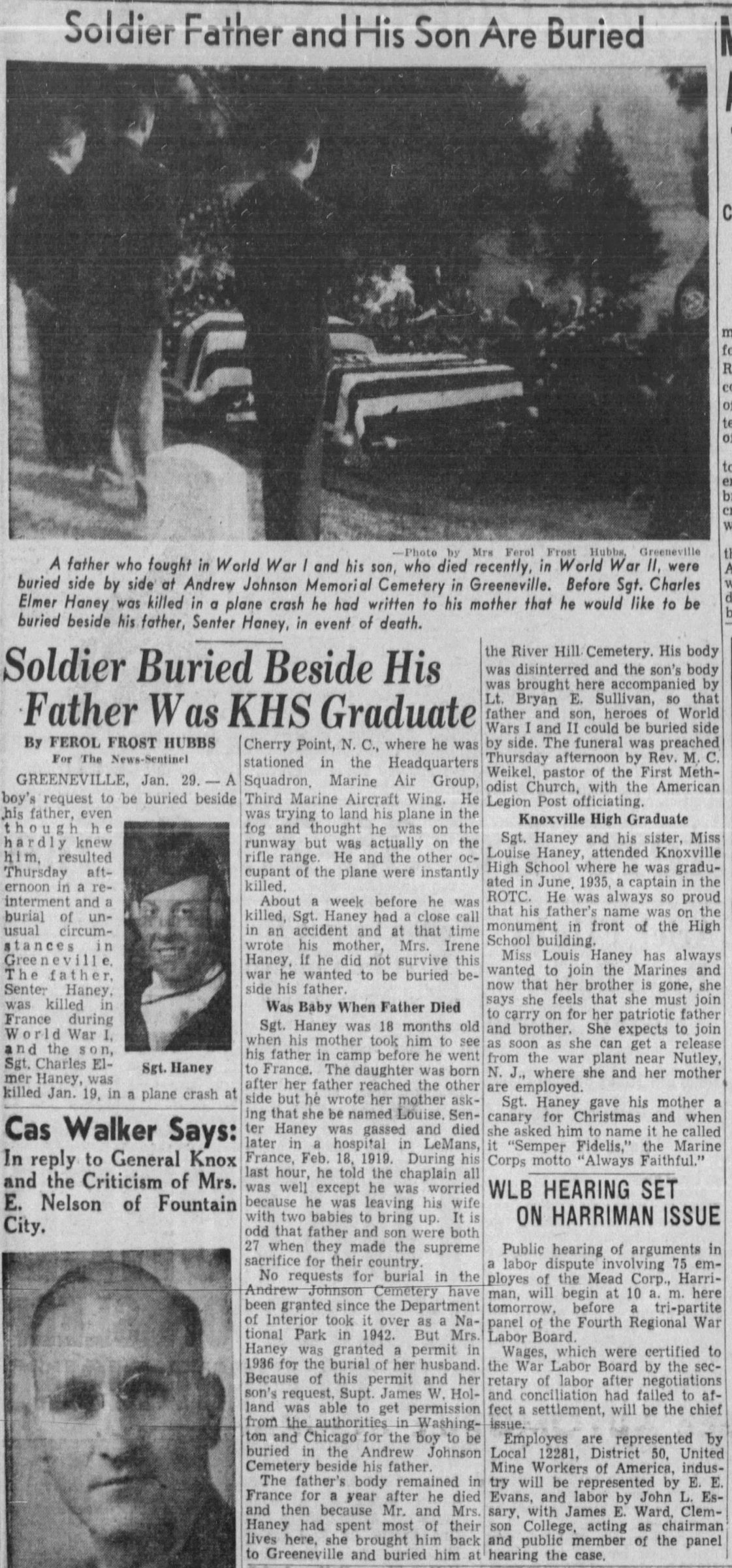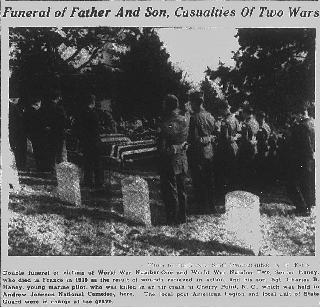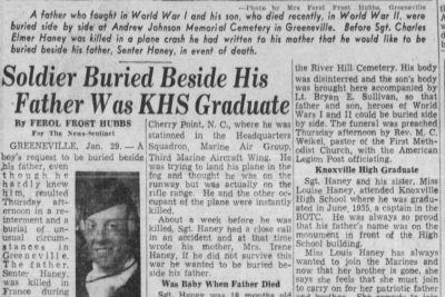 A boy’s request to be buried beside his father, even though he hardly knew him, resulted in a re-interment and a burial of unusual circumstances in Greeneville. The father, Senter Haney, was killed in France During World War I, and the son, Sgt. Charles Elmer Haney, was killed Jan. 19, in a plane crash at Cherry Point, N.C., where he was stationed in the Headquarters Squadron, Marine Air Group, Third Marine Aircraft Wing. He was trying to land his plane in the fog and thought he was on the runway but was actually on the rifle range. He and the other occupant of the plane were instantly killed. About a week before he was killed, Sgt. Haney had a close call in an accident and at that time wrote his mother, Mrs. Irene Haney, if he did not survive this war he wanted to be buried beside his father.