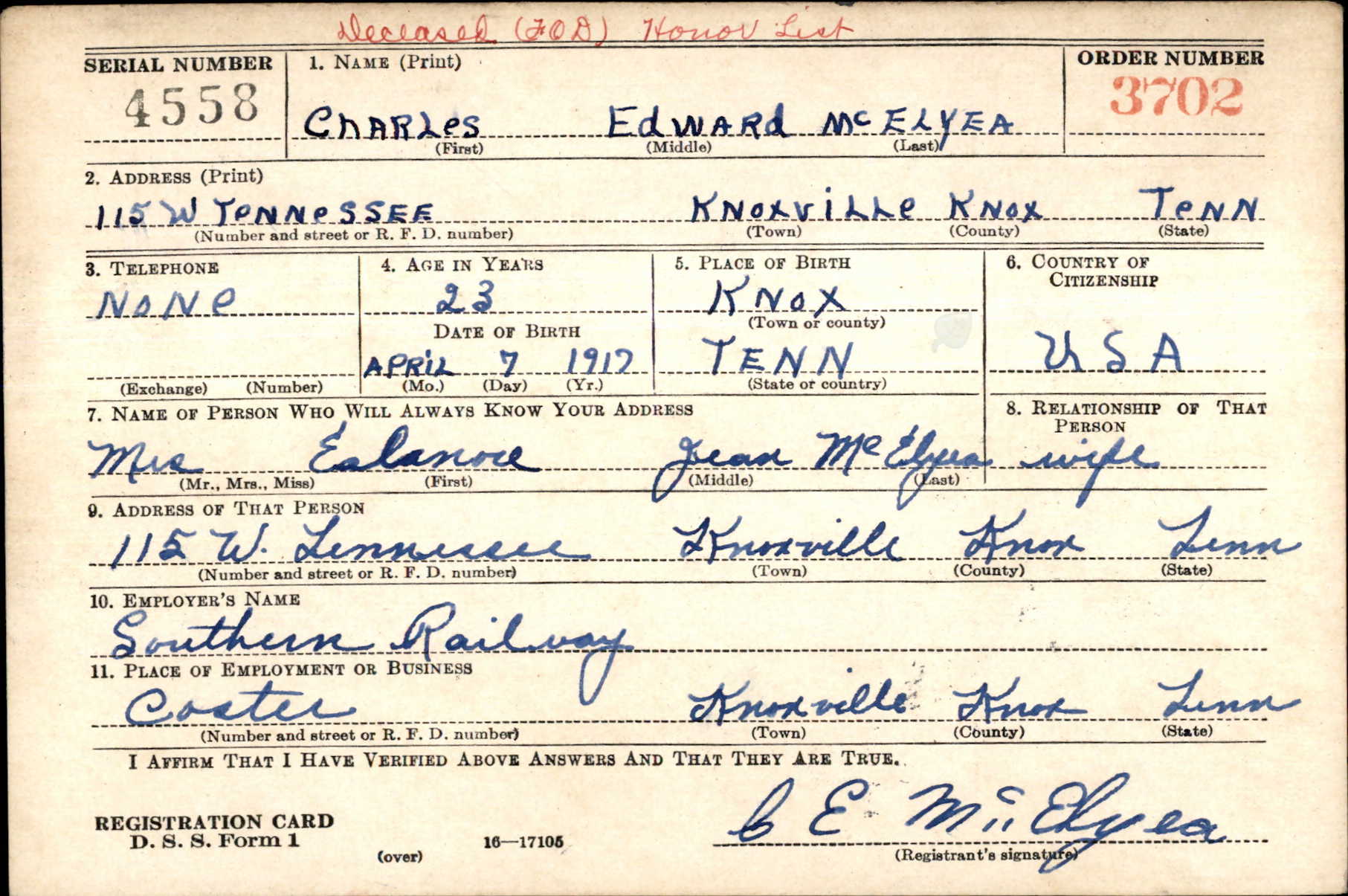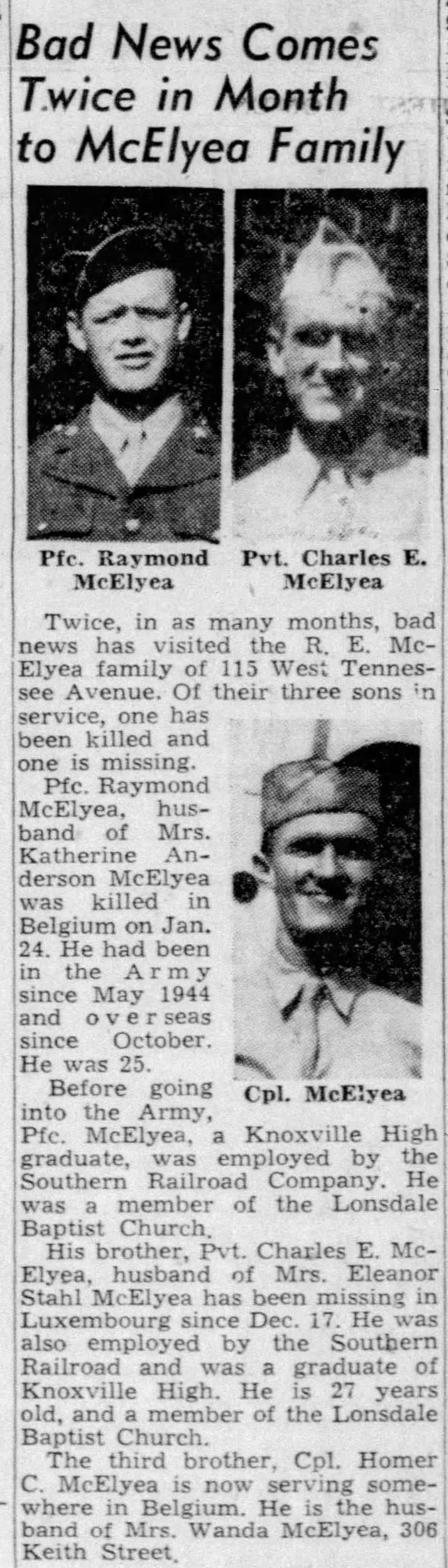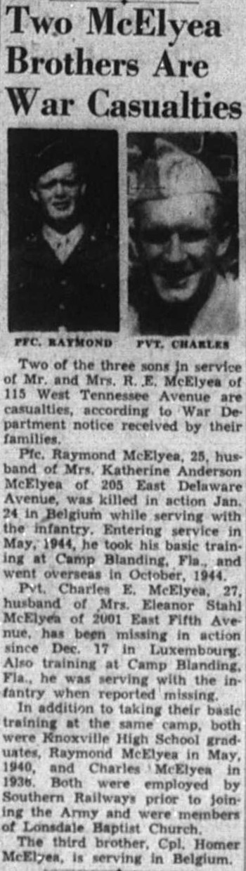 In addition to taking their basic training at the same camp, both were Knoxville High School graduates, Raymond McElyea in May 1941, and Charles McElyea in 1936. Both were employed by Southern Railways prior to joining the Army and were members of Lonsdale Baptist Church.