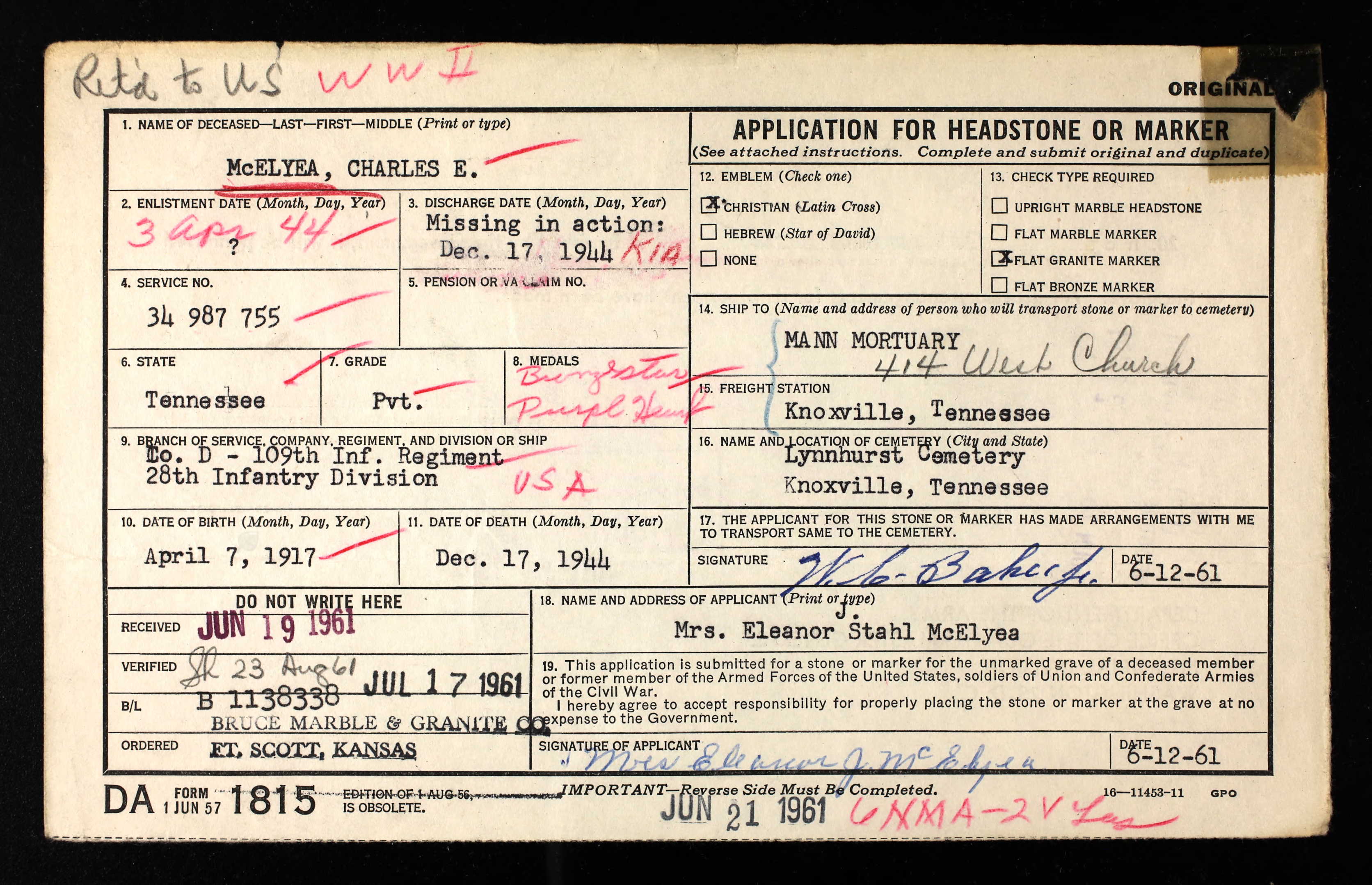 Pvt. Charles E. McElyea, 27, husband of Mrs. Eleanor Stahl McElyea of 2001 East Fifth Avenue, has been missing in action since Dec. 17 in Luxembourg. Also training at Camp Blanding, Fla., he was serving with the infantry when reported missing.