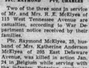 Pfc. Raymodn McElyea, 25, husband of Mrs. Katherine Anderson McElyea of 205 East Delaware Avenue was killed in action Jan. 24 in Belgium while serving with the infantry. Entering service in May, 1944, he took his basic training at Camp Blanding, Fla. And went overseas in October, 1944.