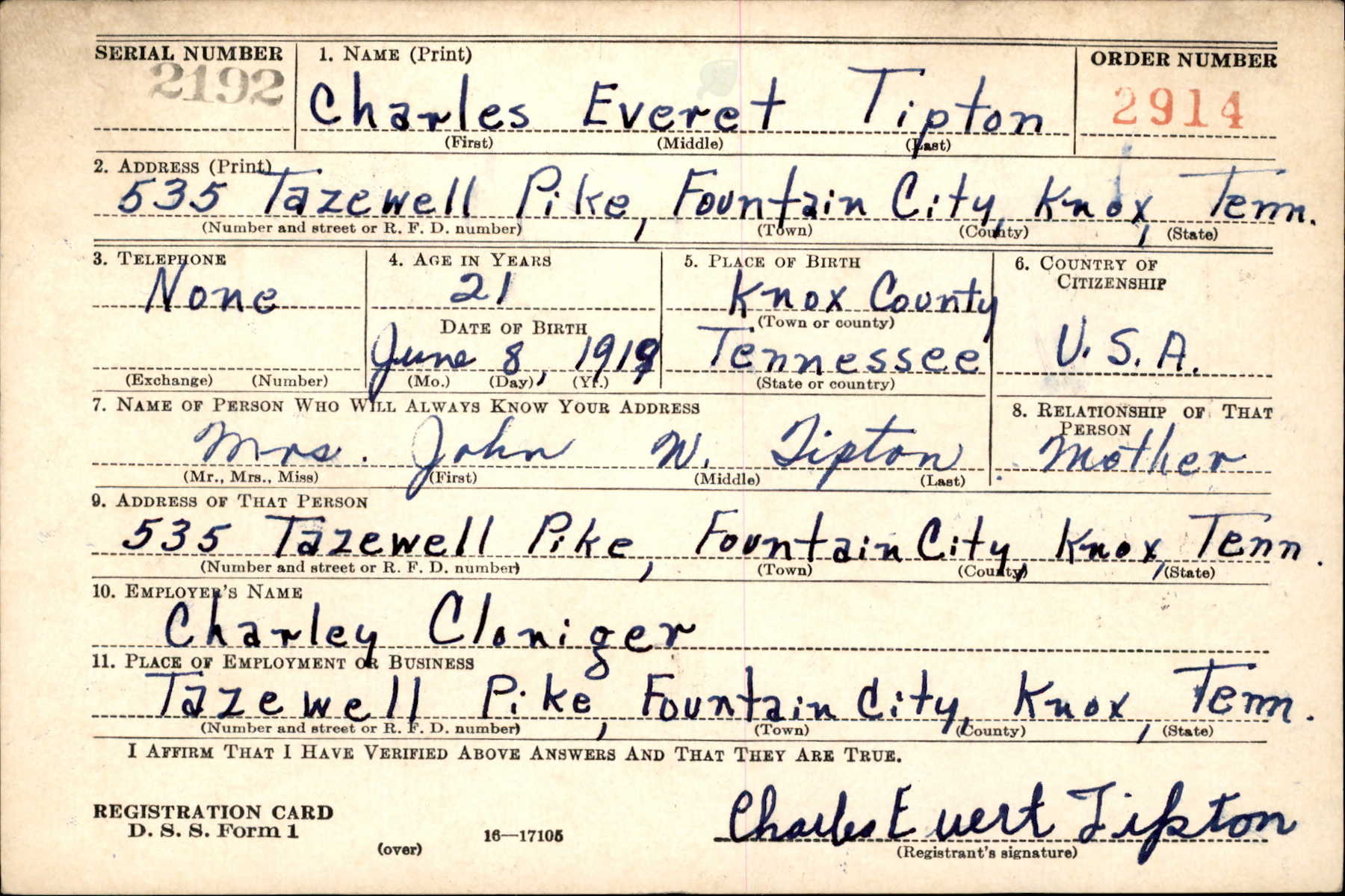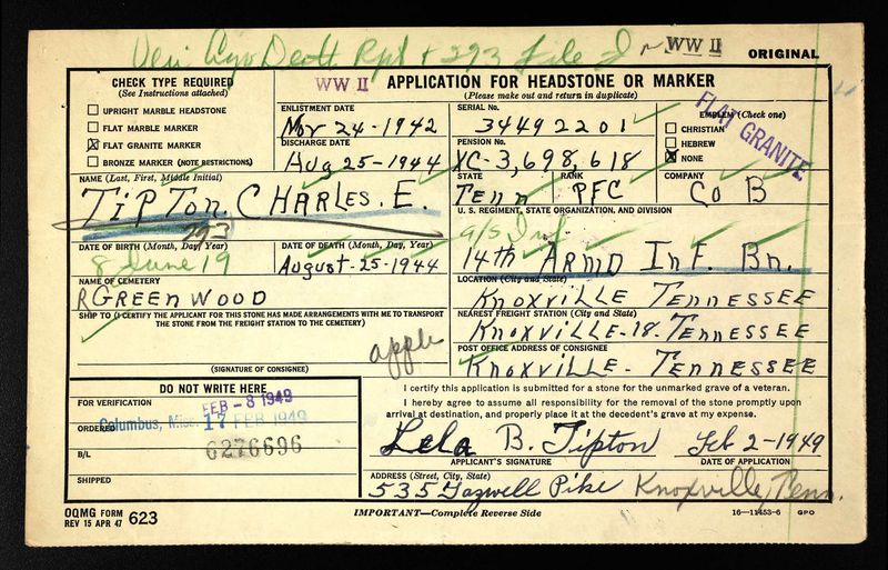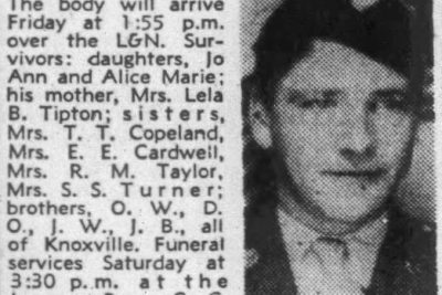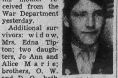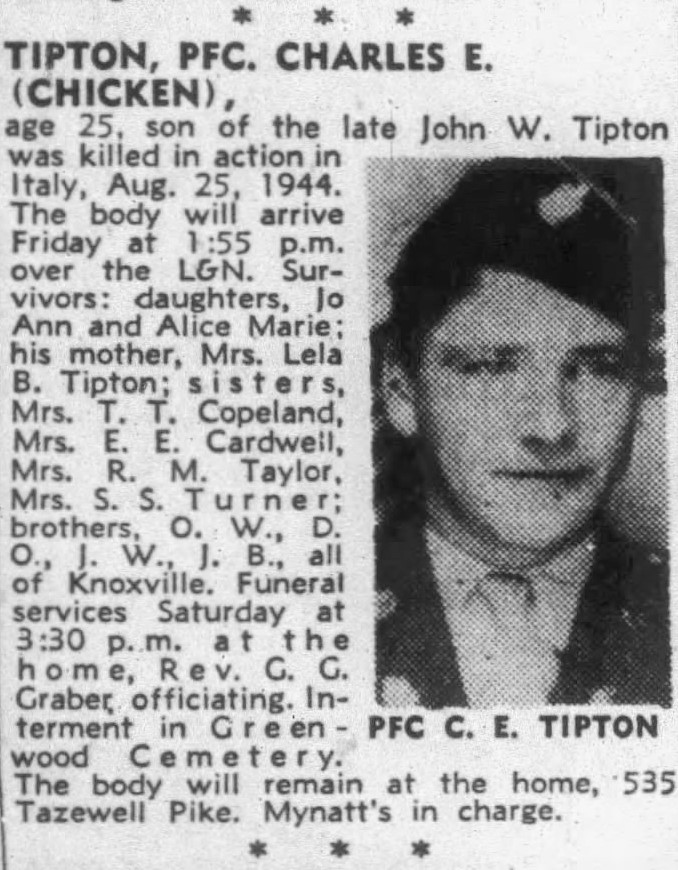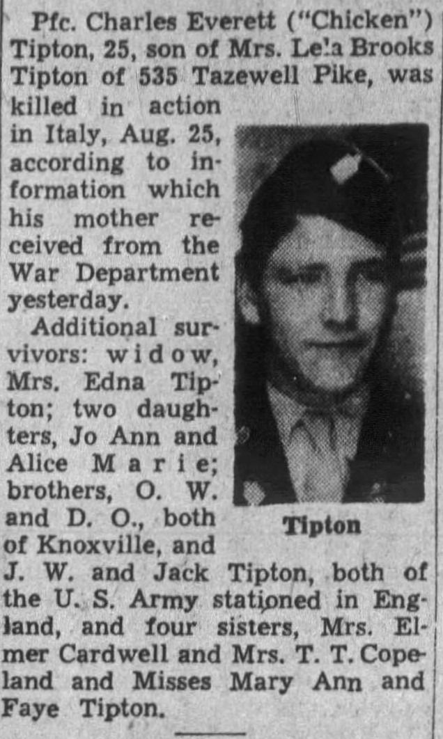 Pfc. Charles Everett (Chicken) Tipton, 25, son of Mrs. Lela Brooks Tipton of 535 Tazewell Pike, was killed in action in Italy, Aug. 25, according to information which his mother received from the War Department yesterday. Additional surivors: widow, Mrs. Edna Tipton; two daughters, Jo Ann and Alice Marie; brothers, O.W. and D.O., both of Knoxville, and J.W. and Jack Tipton, both of the U.S. Army stationed in England, and four sisters,Mrs. Elmer Cardwell and Mrs. T.t. Copeland and Misses Mary ann and Faye Tipton.