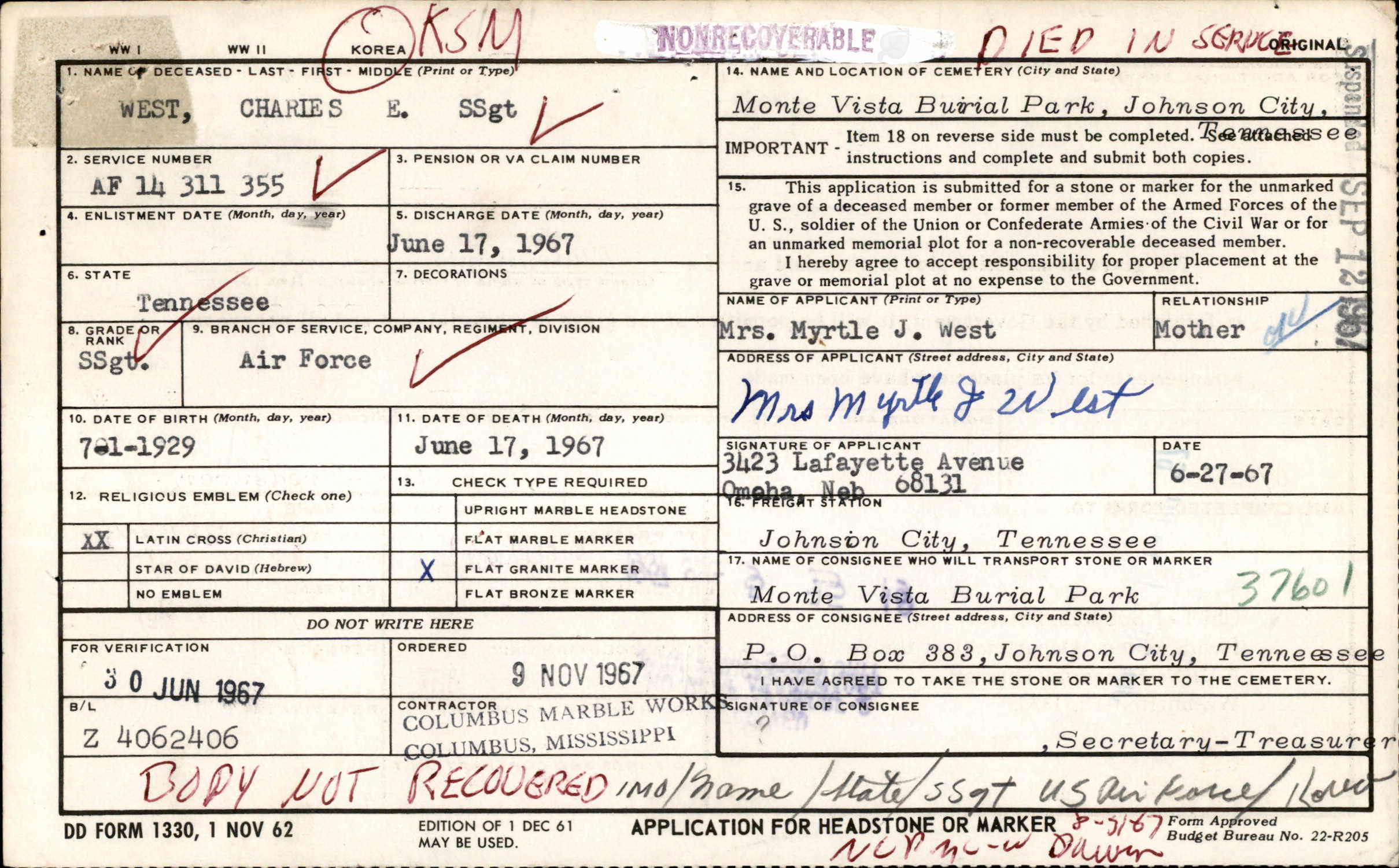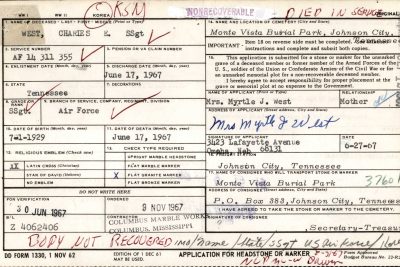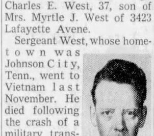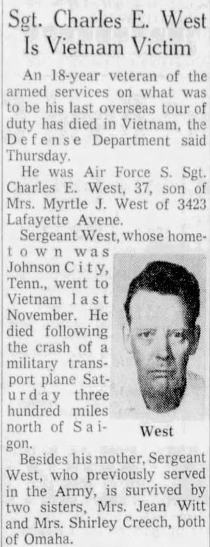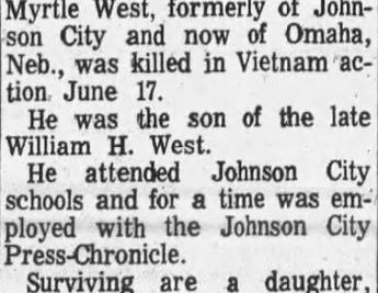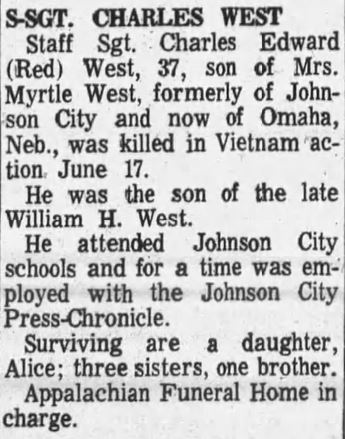 Staff Sgt. Charles Edward ( Red) West, 37, son of Mrs. Myrtle West, formerly of Johnson City and now of Omaha Neb., was killed in Vietnam action June 17. He was the son of the late William H. West. He attended Johnson City School and for a time was employed with the Johnson City Press-Chronicle. Surviving are a daughter, Alice; three sisters and one brother.