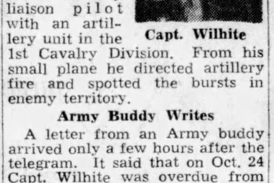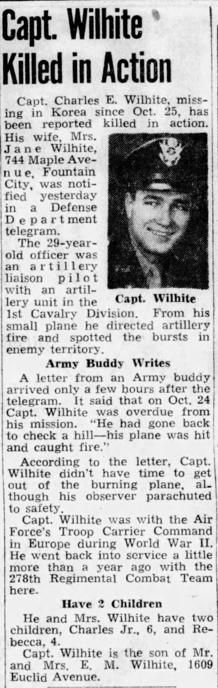 Captain Wilhite and his fellow observer flew a single engine L-19 Bird Dog plane made for the Army by Cessna Aircraft Manufacturers. On October 25, 1951, having taken off from an airstrip in Korea, Captain Wilhite had spotted an area for enemy troop and artillery movement in North Korea. When their reconnaissance mission returned them to the same area later an enemy artillery placement had been established and Captain Wilhite’s plane was hit and caught fire. His observer parachuted to safety but Captain Wilhite was killed when the aircraft crashed.