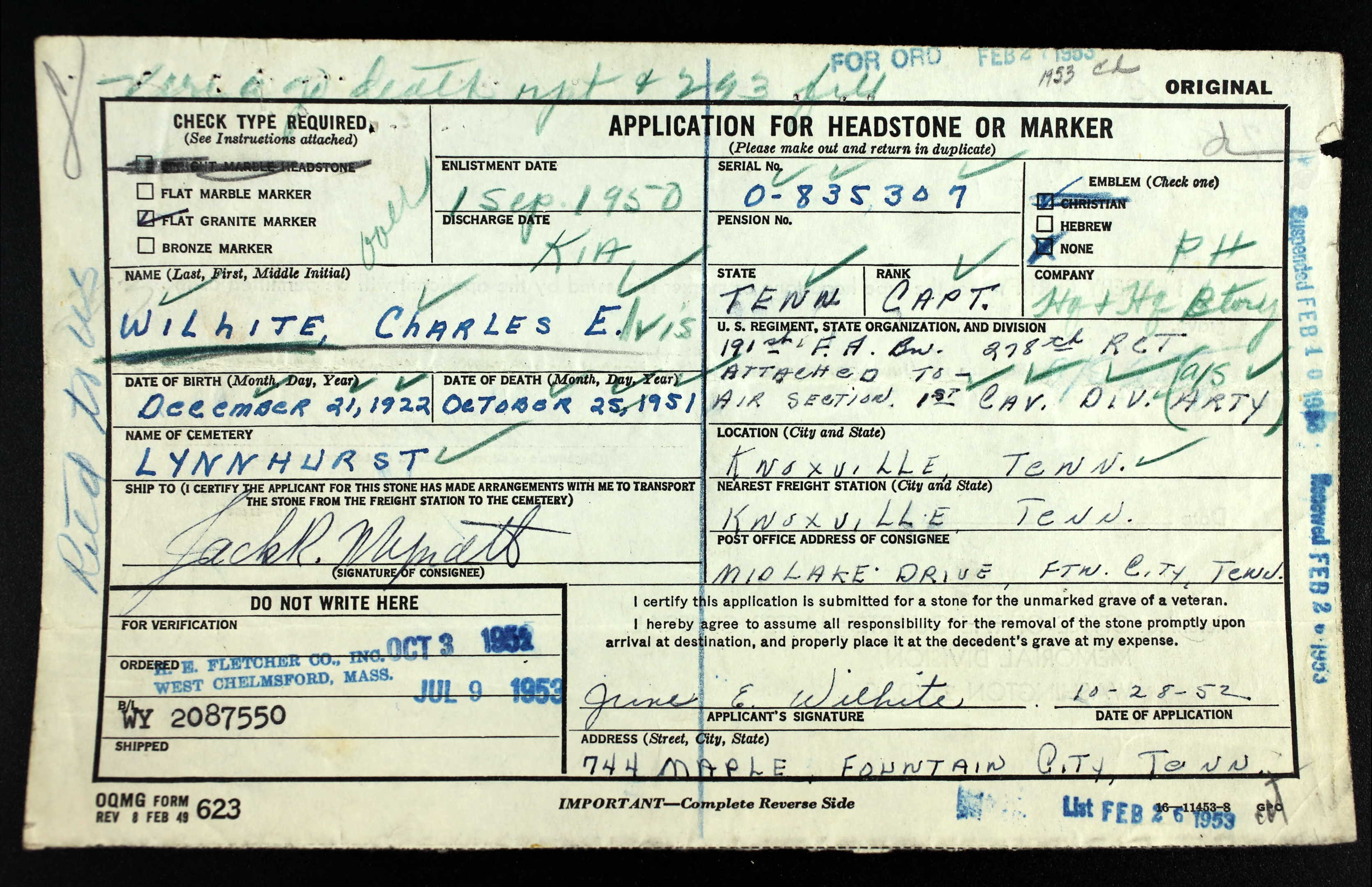 The report of his death reached Knoxville just before Christmas 1951. Captain Charles Wilhite was returned to Knoxville over the Southern Railway on April 24, 1952, and funeral services were held at Berry Funeral Home Chapel the following afternoon. He was laid to rest in Lynnhurst Cemetery with full military honors by The American Legion Post #2. In addition to his parents, wife, and children, Charles left a brother, Estil Mack Wilhite, Jr., and a sister Mrs. Thelma Hardin, wife of Nathan Hardin and a grandmother, Mrs. Johanna Wilhite. His son, Charles E. Wilhite, Jr., assisted in the composing of his father’s biography for the East Tennessee Veterans Memorial Association.