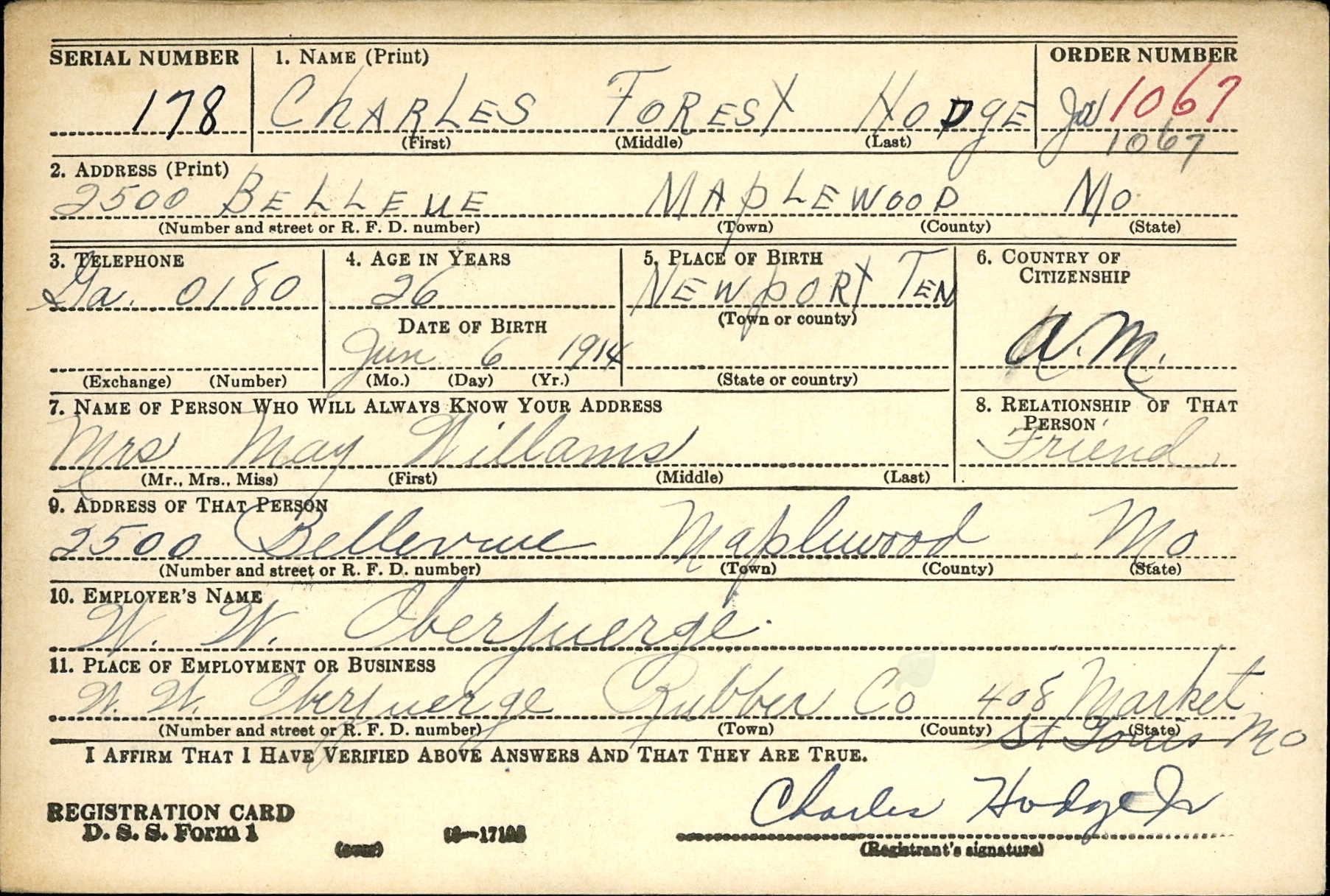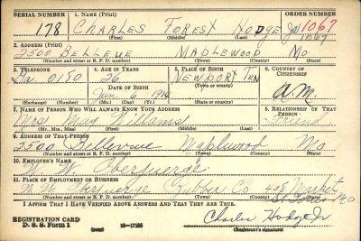 Charles Forest Hodge Jr. was born 6 June 1914 at New Port, Tennessee, the son of Charles Forest Hodge Sr. and Edith Delina Balch.