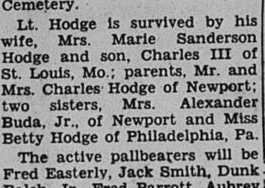 Lt. Hodge is survived by his wife, Mrs. Marie Sanderson Hodge and son Charles III of St. Louis, Mo.; parents, Mr. and Mrs. Charles Hodge of Newport; two sisters, Mrs. Alexander Buda Jr., of Newport and Miss Betty Hodge of Philadelphia, Pa.