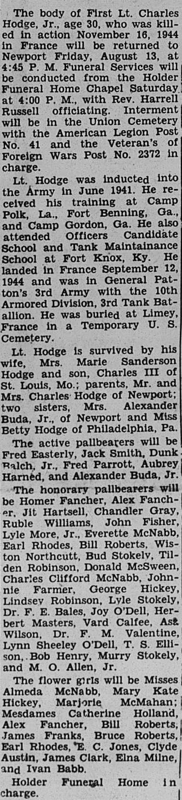 The body of First Lt. Charles Hodge, Jr., age 30, who was killed in action November 16, 1944 in France will be returned to Newport Fiday, August 13 at 4:45 P.M. Lt. Hodge was inducted into the Army in June 1941. He received his training at Camp Polk, La., Fort Benning,Ga., and Camp Gordon, Ga. He also attended Officers Candidate School and Tank Maintainance School at Fort Knox, Ky. He landed in France September 12, 1944 and was in General Patton’s 3rd Army with the 10th Armored Division, 3rd Tank Battalion. He was buried at Limey, France in a Temporary U.S. Cemetery.