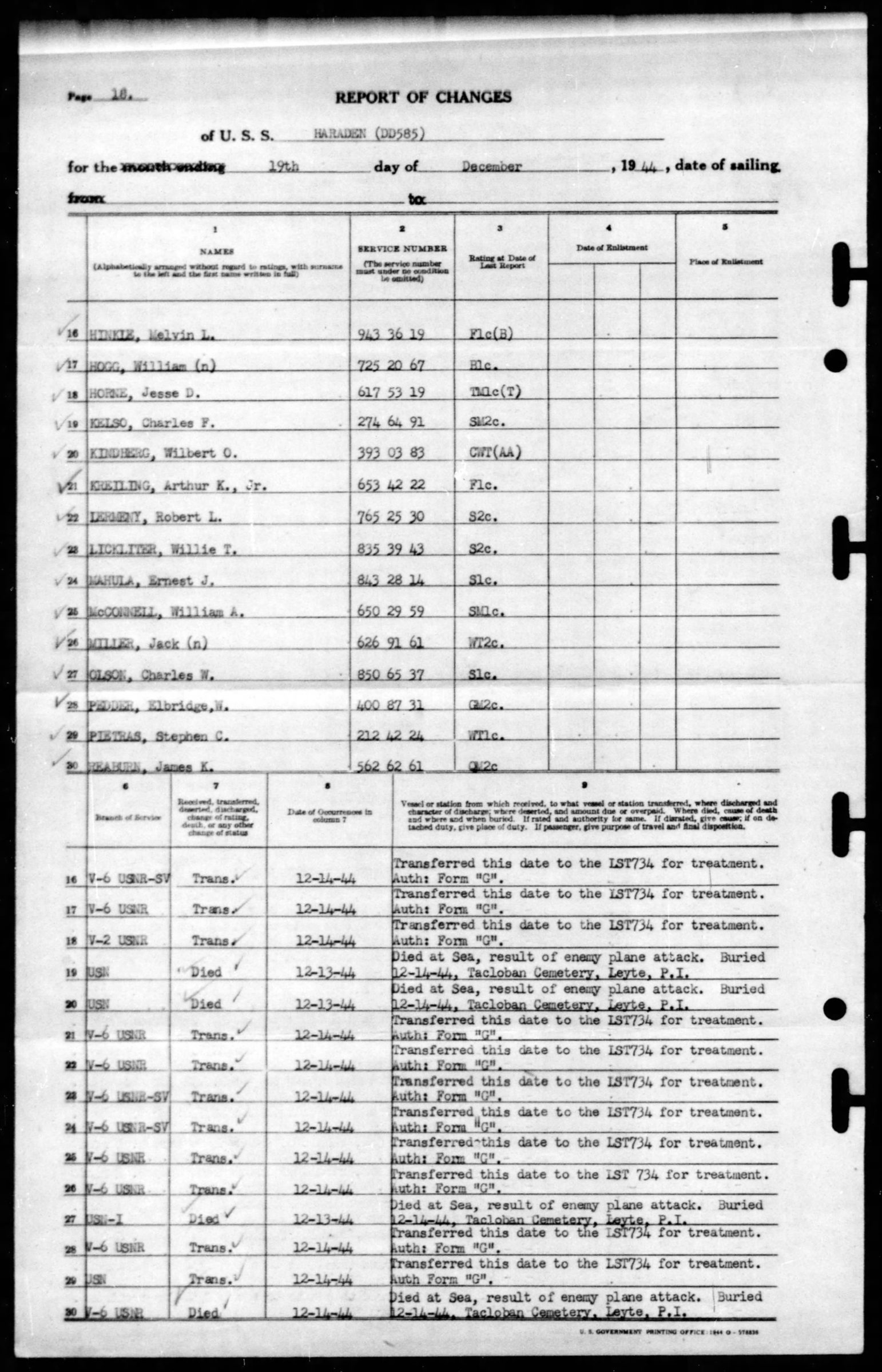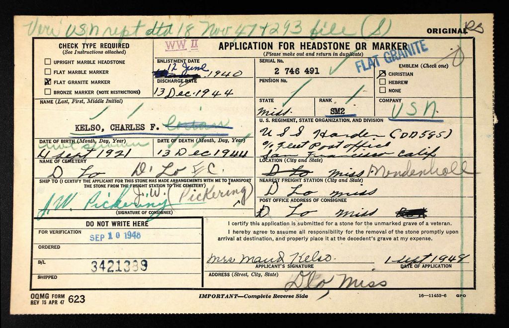 Charles Kelso served on the U.S.S. Harden (DD585). He died at sea after an enemy plane attack. He was initially buried on 14 December 1944 at Tacloban Cemetery, Leyte, Philippine Islands.