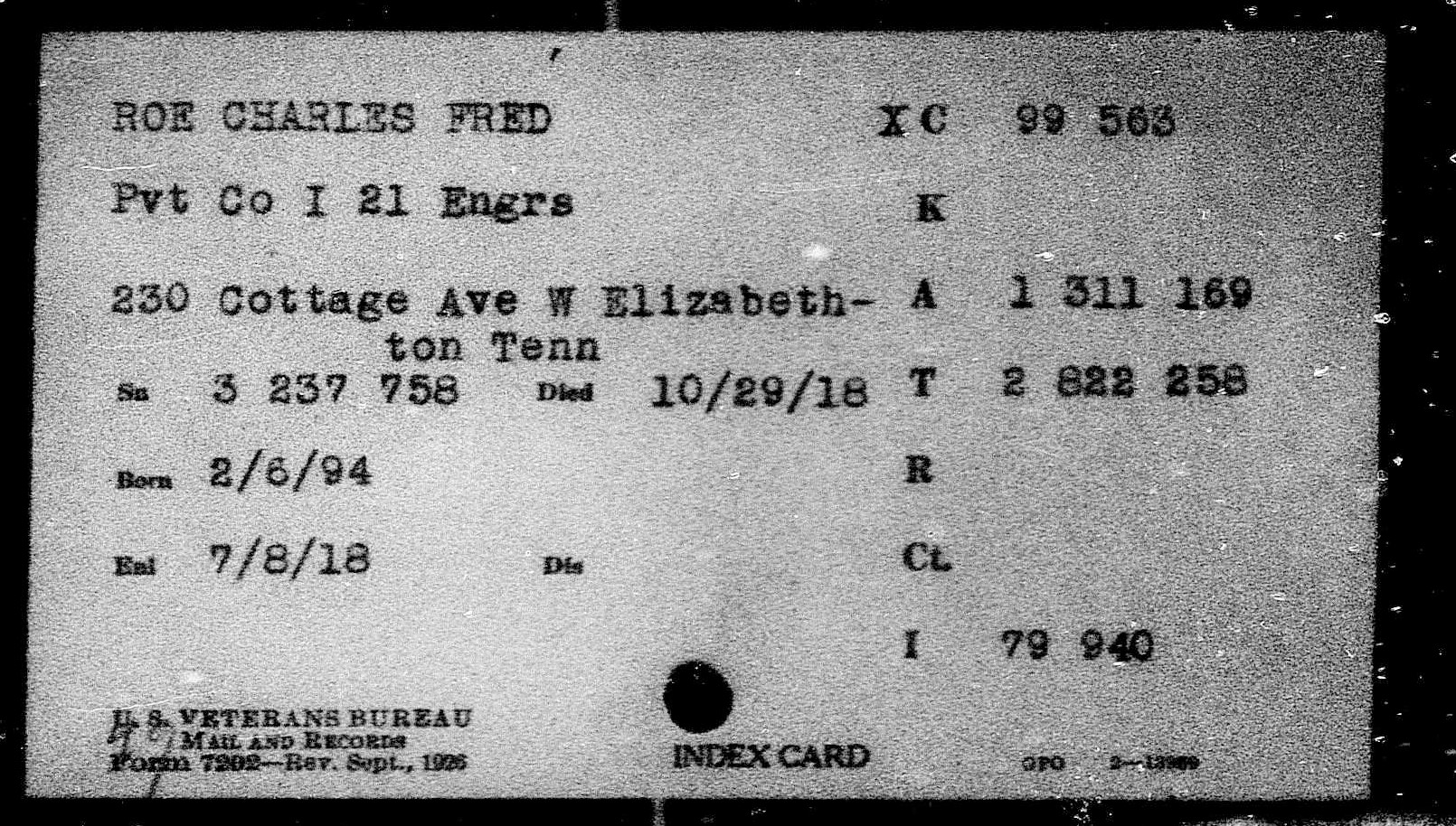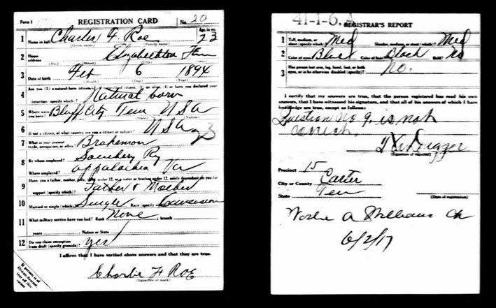 Charles Fred Roe was born 6 February 1894 in Bluff City, Sullivan County, Tennessee, the son of Andrew Johnson Roe and Nannie Harkleroad. Brother of Sgt. Clarence Gaines Roe who died during World War II.