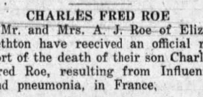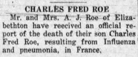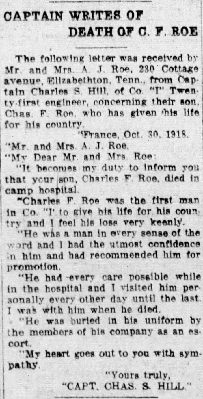 The following letter was received by Mr. and Mrs. A.J. Roe, 230 Cottage avenue, Elizabethton, Tenn., from Captain Charles S. Hill, of Co “I” Twenty-first engineer, concerning their son, Chas F. Roe, who has given his life for his country.