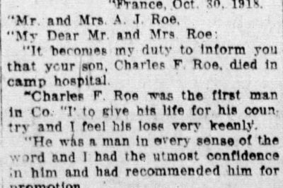 It becomes my duty to inform you that your son, Charles F. Roe, died in camp hospital. Charles F. Roe was the first man in Co. “I” to give his life for his country and I feel his loss very keenly. He was a man in every sense of the word and I had the utmost confidence in him and had recommended him for promotion. He had every care possible while in the hospital and I visited him personally every other day until the last I was with him when he died. He was buried in his uniform by the members of his company as an escort. My heart goes out to you with sympathy.