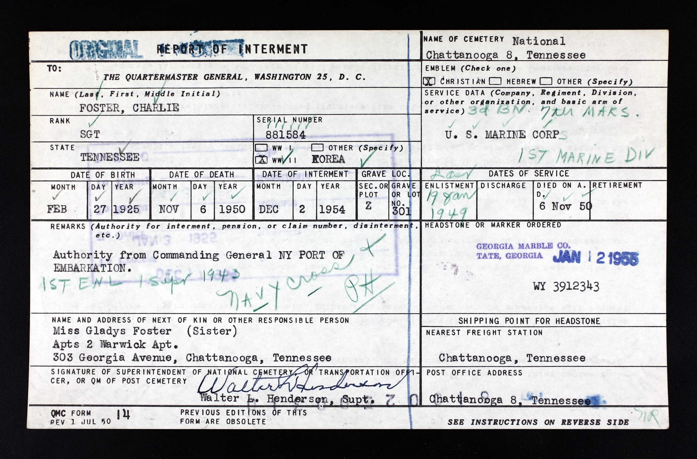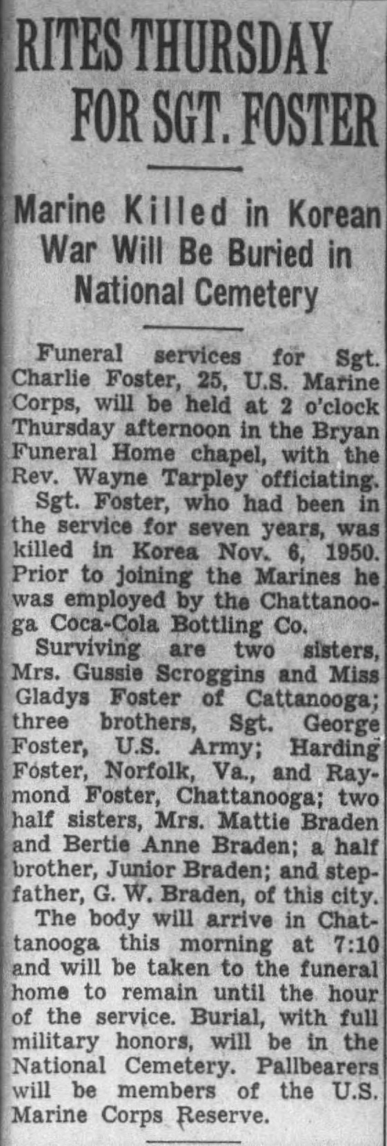 Funeral services for Sgt. Charlie Foster, 25, U.S. Marine Corps, will be held at the Bryan Funeral Home chapel. Sgt. Foster, who had been in the service fors even years, was killed in Korea Nov. 6, 1950. Prior to joining the Marines he was employed by the Chattanooga Coca-Cola Bottling Co. Surviving are two sisters, Mrs. Gussie Scroggins and Miss Gladys Foster of Chattanooga; three brothers, Sgt. George Foster, U.S. Army; Harding Foster, Norfolk, Va., and Raymond Foster, Chattanooga; two half sisters, Mrs. Mattie Braden and Bertie Anne Braden; a half brother, Junior Braden; and stepfather G.W. Braden of this city.