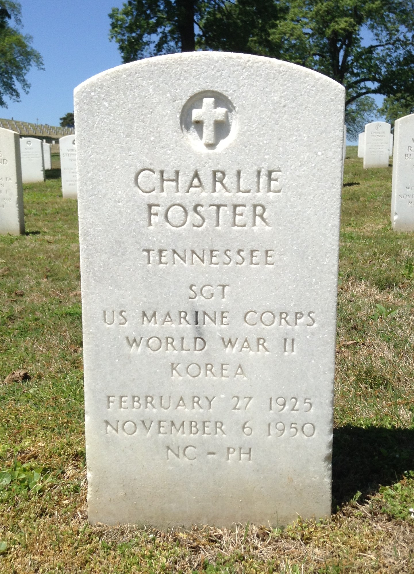 The President of the United States of America takes pride in presenting the Navy Cross Posthumously to Sergeant Charlie Foster MCSN 881584, United States Marine Corps, for extraordinary heroism in connection with military operations against an armed enemy of the United Nations while serving as a Platoon Sergeant in Company H, Third Battalion, Seventh Marines, FIRST Marine Division Reinforced, in action against enemy aggressor forces in the Republic of Korea on 6 November 1950. Spearheading his platoon’s assault against a numerically superior enemy, heavily reinforced with machine guns and occupying well-concealed positions on the crest of a ridge, Sergeant Foster pressed his attack with aggressive determination, inspiring his men to follow and fight their way through a vicious hail of hostile fire until they had reached the ridge-top. Then, reorganizing the unit for a final assault against the fanatical enemy, he took the lead and successfully launched a fierce onslaught, moving confidently through the terrific volume of small-arms, mortar, machine-gun and grenade fire hurled by the desperate hostile force, maneuvering his men over the jagged terrain, and neutralizing the enemy machine guns which had delayed the friendly advance. Finally, with the accomplishment of his objective in view, and an enemy rout virtually assured, Sergeant Foster fell mortally wounded. His superb courage, determined leadership and valiant fighting spirit in the face of overwhelming odds were in keeping with the highest traditions of the United States Naval Service. He gallantly gave his life for his country. Authority Board of Awards Serial 1132 November 1, 1951