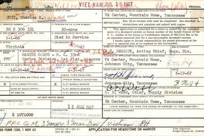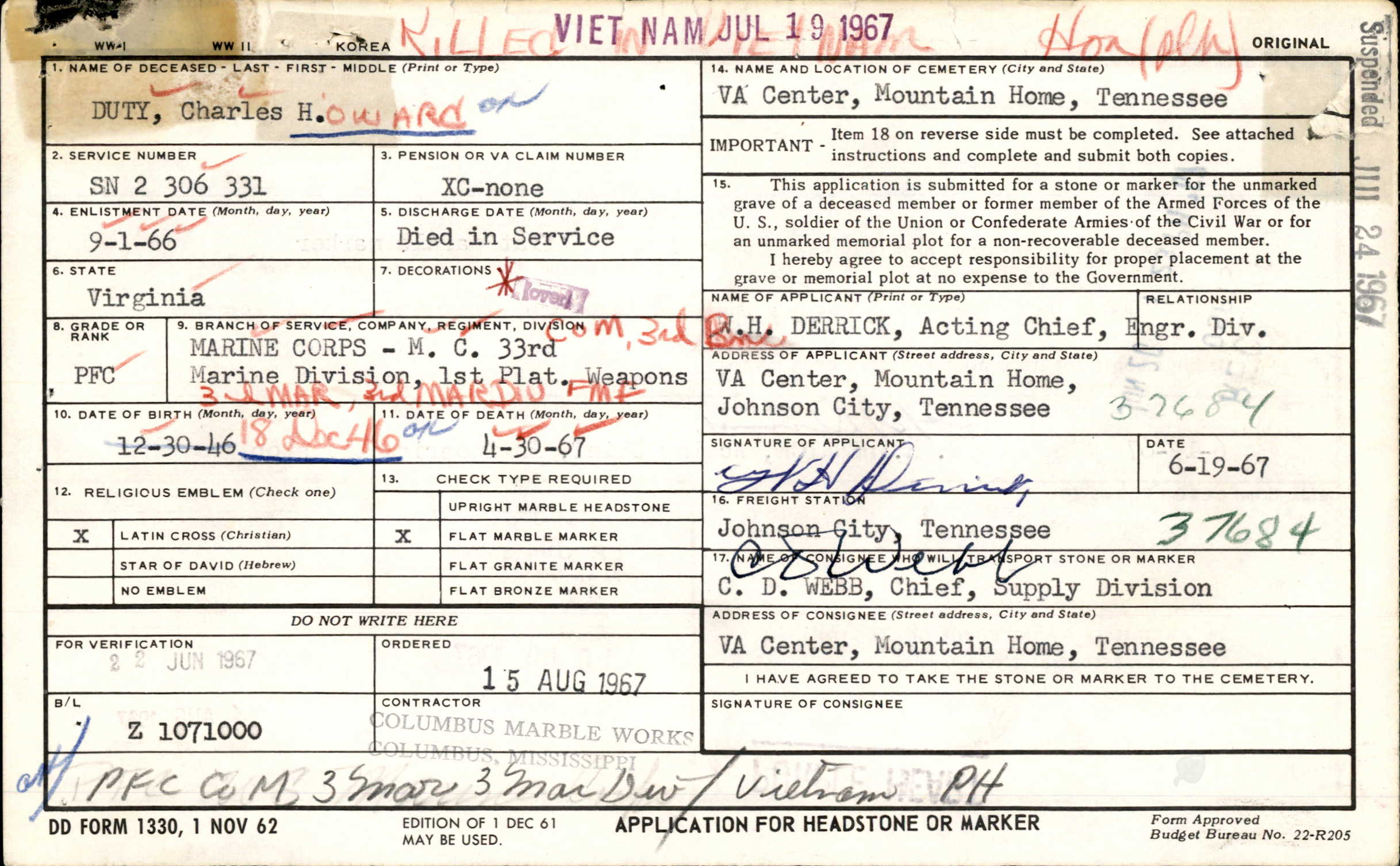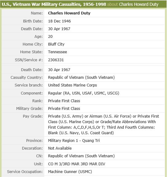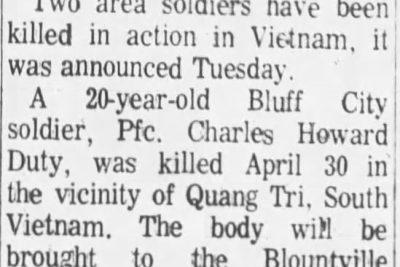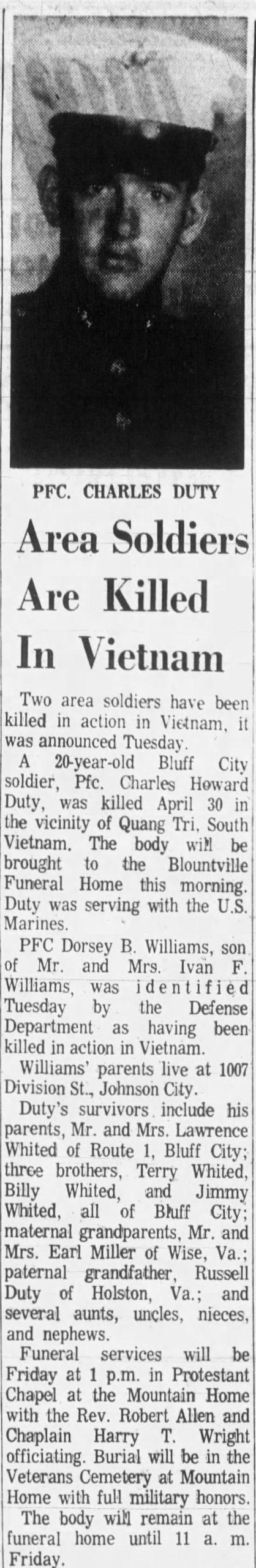 A 20-year-old Bluff City soldier, Pfc. Charles Howard Duty, was killed April 30 in the vicinity of Quang Tri, South Vietnam. Duty was serving with the U.S. Marines. Survivors include his parents, Mr. and Mrs. Lawrence Whited of Route 1, Bluff City; three brothers, Terry Whited, Billy Whited, and Jimmy Whited, all of Bluff City; maternal grandparents, Mr. and Mrs. Earl Miller of Wise, Va.; paternal grandfather, Russell Duty of Holston, Va.; and several aunts, uncles, nieces and nephews.