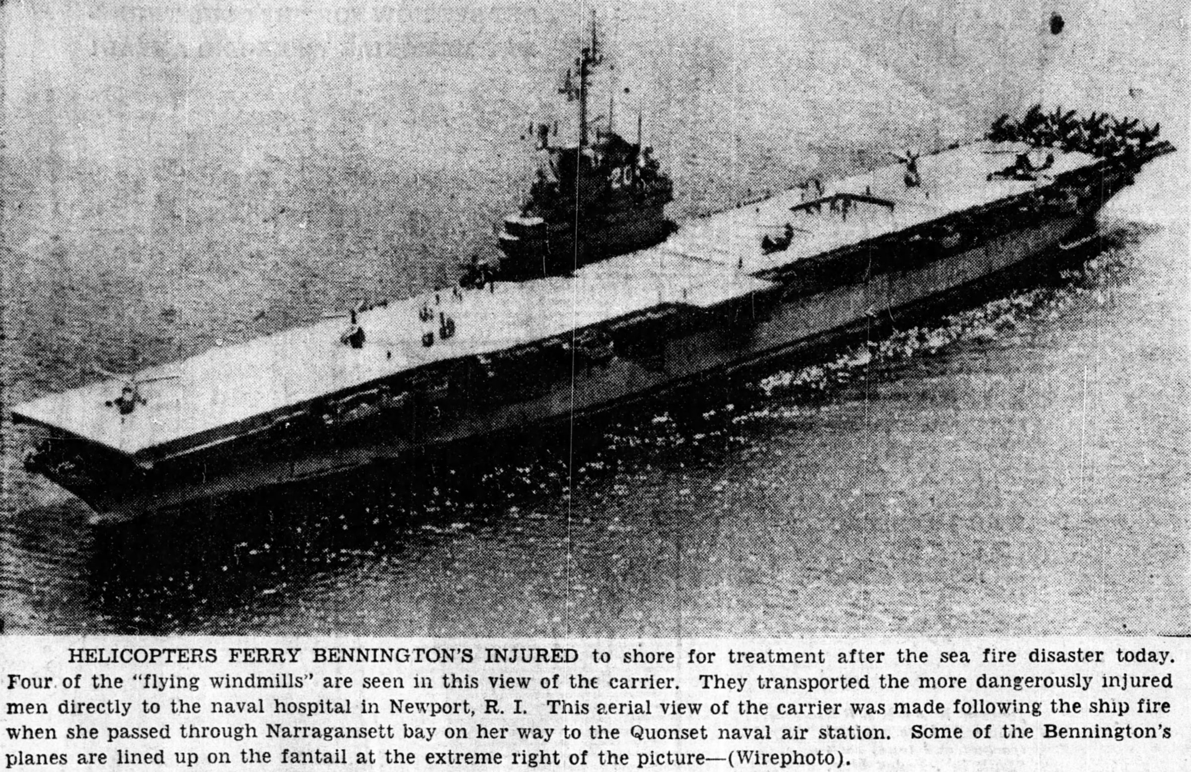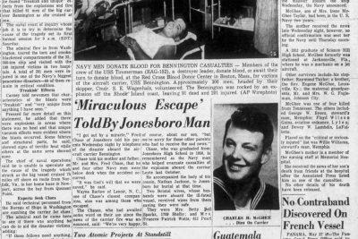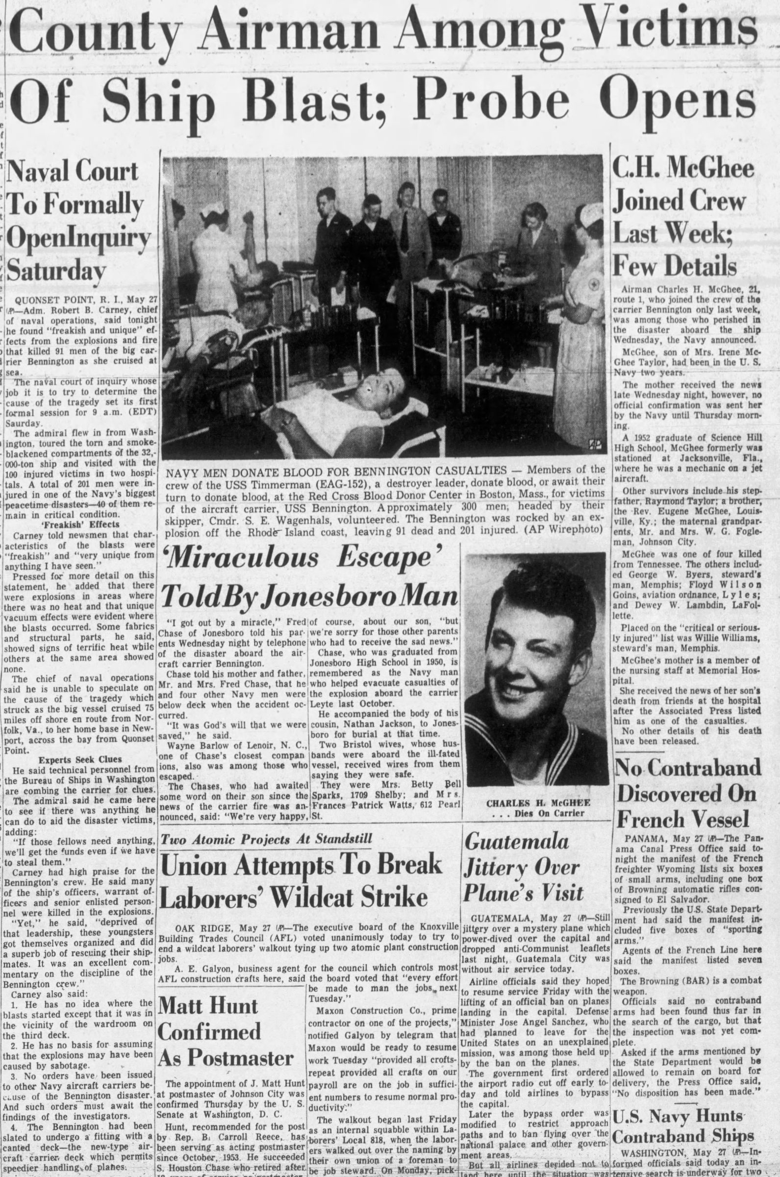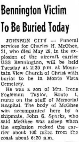 Airman Charles H. McGhee, 21, route 1, who joined the crew of the carrier Bennington only last week, was among those who perished in the disaster, aboard the ship Wednesday, the Navy announced. McGhee, son of Mrs. Irene McGhee Taylor, had been in the U.S. Navy two years. The mother received the news late Wednesday night, however, no official confirmation was sent her by the Navy until Thursday morning. A 1952 graduate of Science Hill High School, McGhee formerly was stationed at Jacksonville, Fla., where he was a mechanic on a jet aircraft. McGhee was one of four killed from Tennessee. The others include Geore W. Byers, Floyd Wilson Goins, Lyles; and Dewey W. Lambdin.