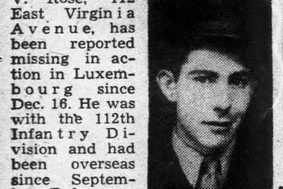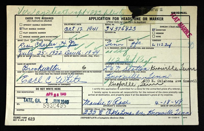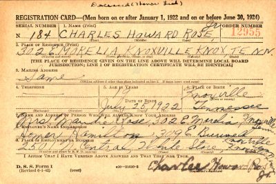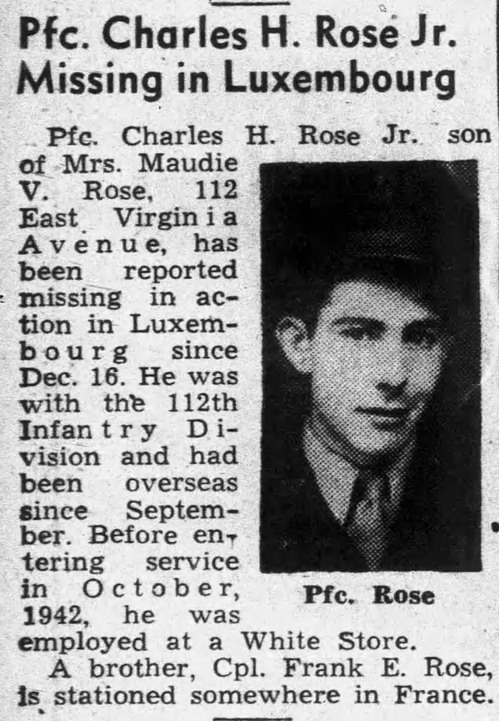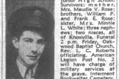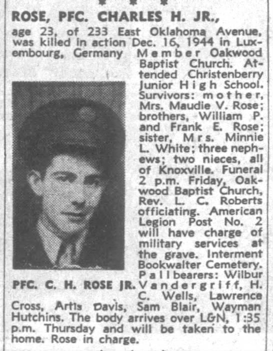 Pfc. Charles H. Rose Jr., age 23, of 233 East Oklahoma Avenue, was killed in action Dec. 16, 1944 in Luxembourg. He was with the 112th Infantry Divisionand had been overseas since September. Member Oakwood Baptist Church. Attended Christenberry Junior High School. Survivors: mother, Mrs. Maudie V. Rose; brothers, William P. and Frank E. Rose; sister, Mrs. Minnie L. white; three nephews; two nieces, all of Knoxville.