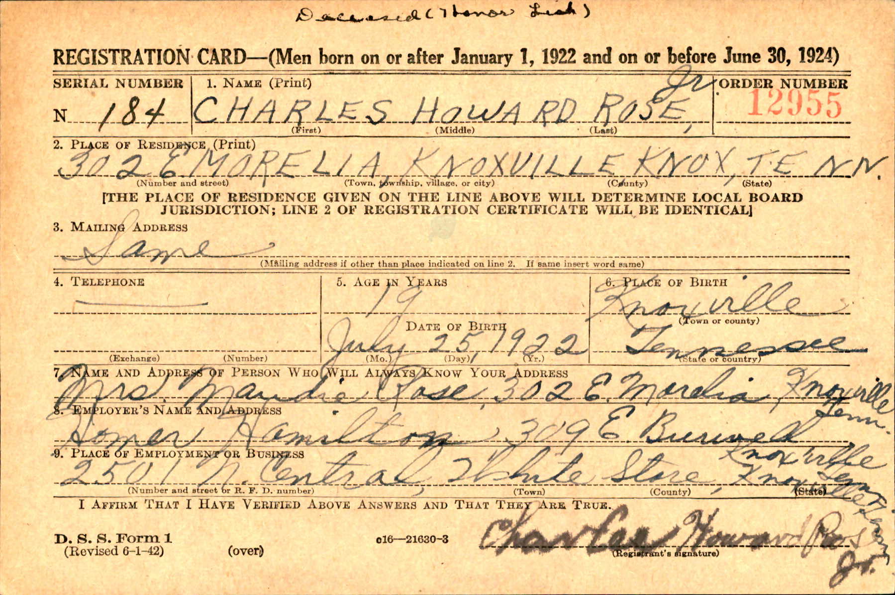 Charles Howard Rose was born on 25 July 1922 in Knoxville, Tennessee, the son of Charles Howard Rose and Maudie Vesta Day.