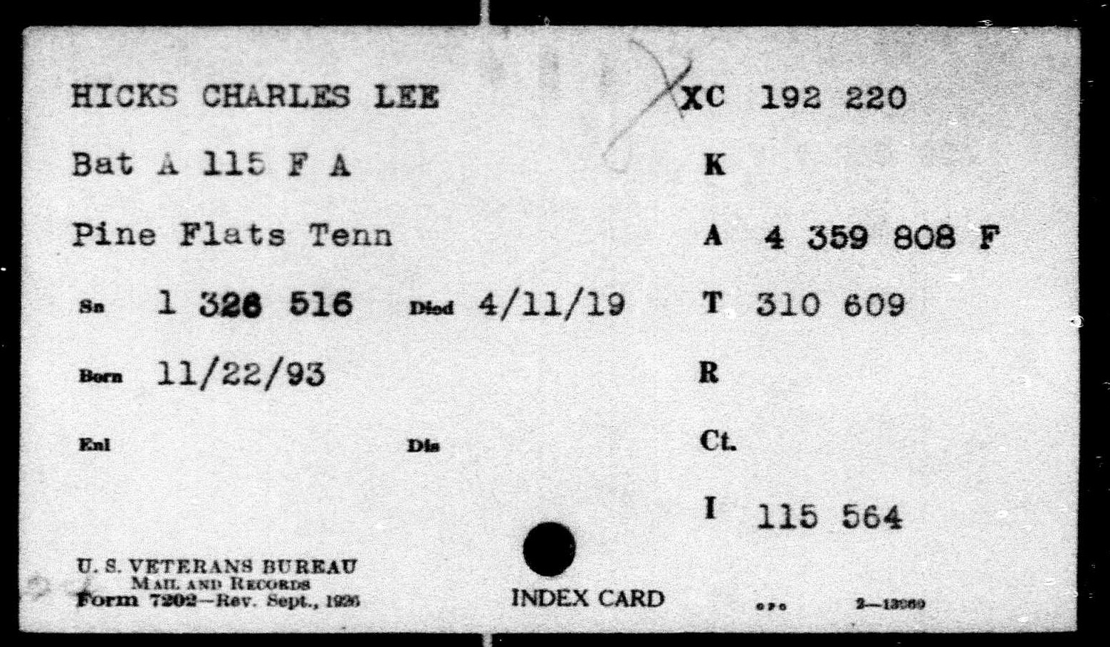 He was severely wounded on 9 November 1918 and died of broncho pneumonia on 11 April 1919. He is buried in the New Bethel Presbyterian Church Cemetery (old section) in Piney Flats, TN.