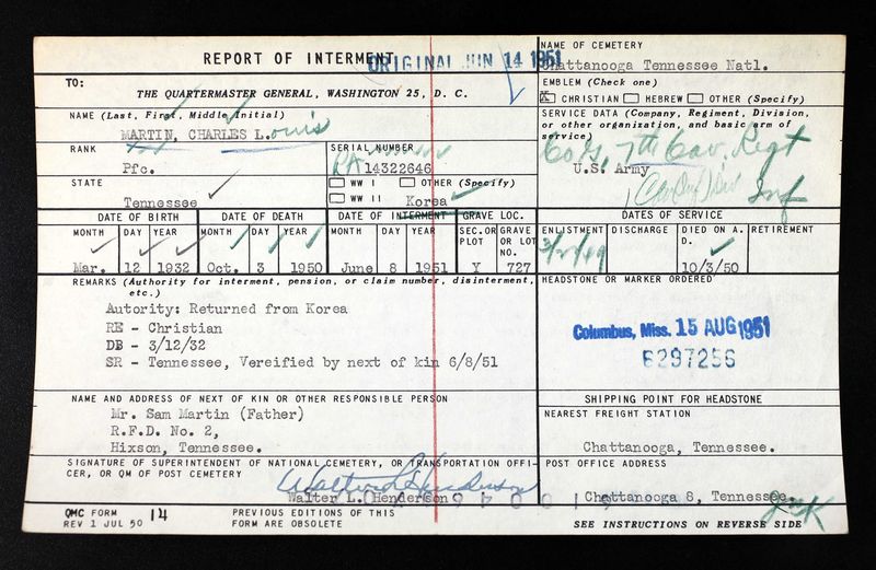 Private First Class Martin was a member of the 7th Cavalry Regiment, 1st Cavalry Division. He was seriously wounded by the enemy in South Korea on August 12, 1950 and returned to duty on September 12, 1950. He died of other causes in Korea.
