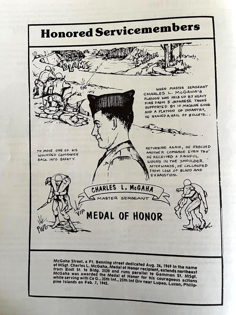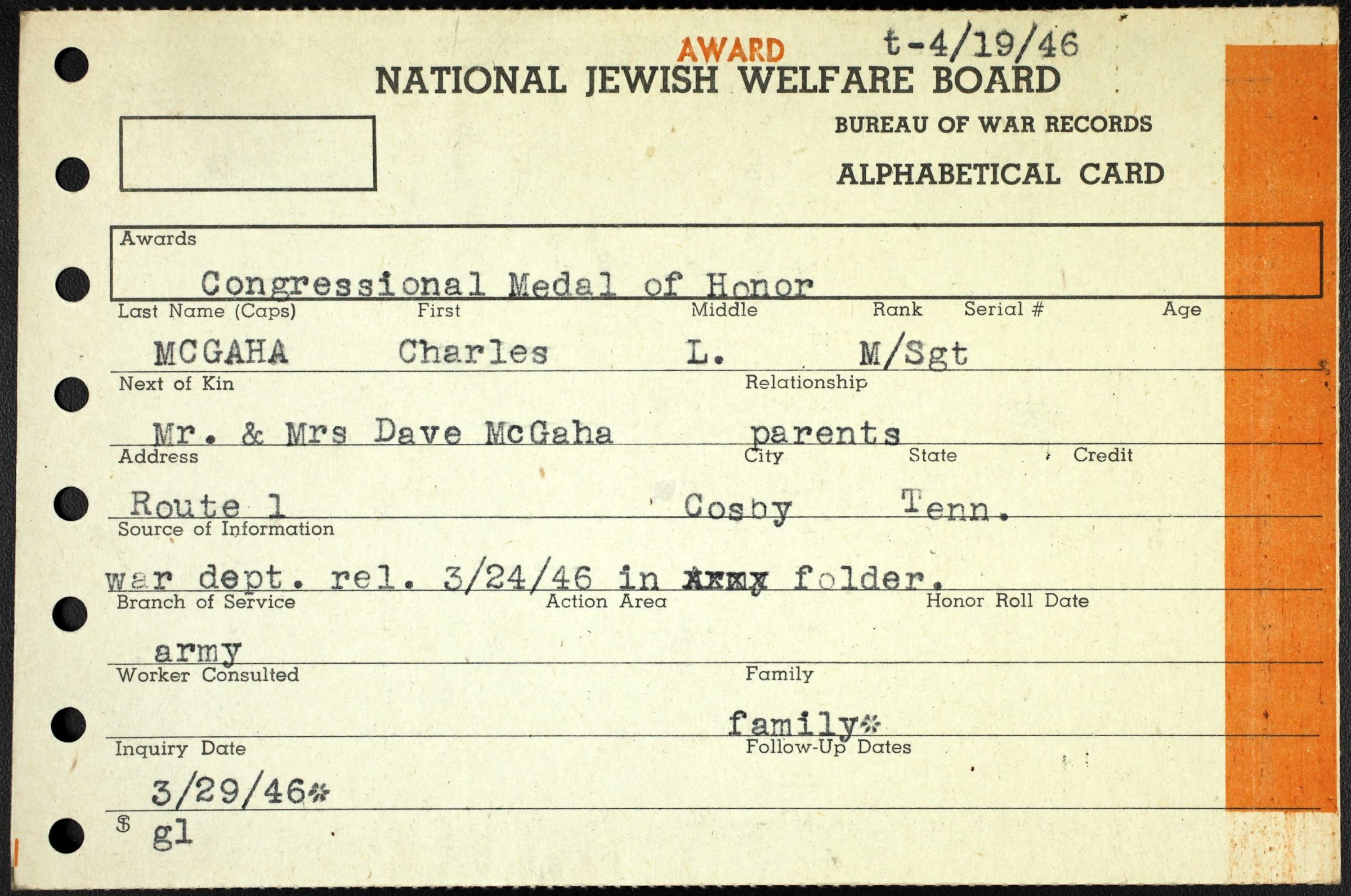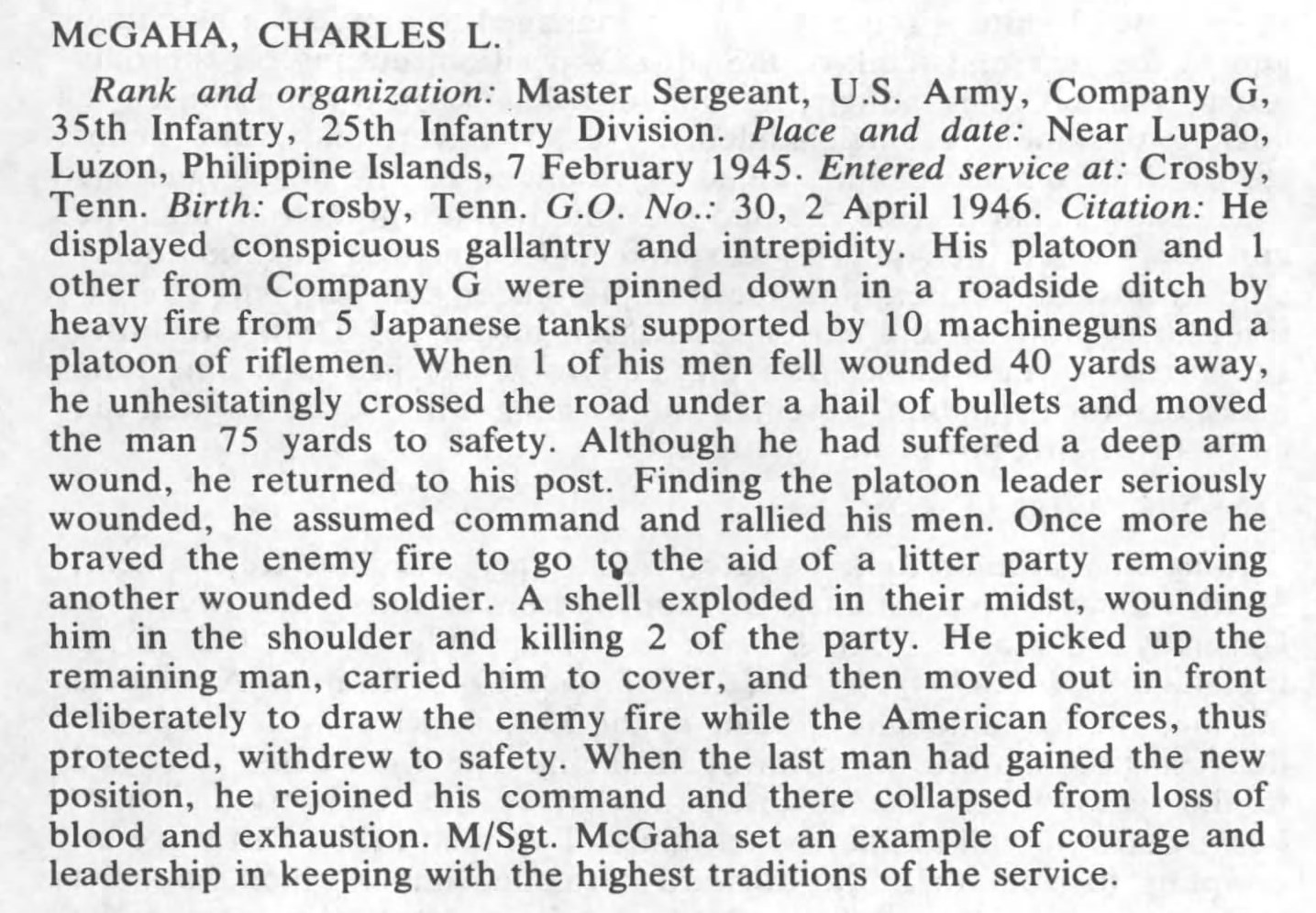 When the last man had gained the new position, he rejoined his command and there collapsed from loss of blood and exhaustion. M/Sgt. McGaha set an example of courage and leadership in keeping with the highest traditions of the service.”