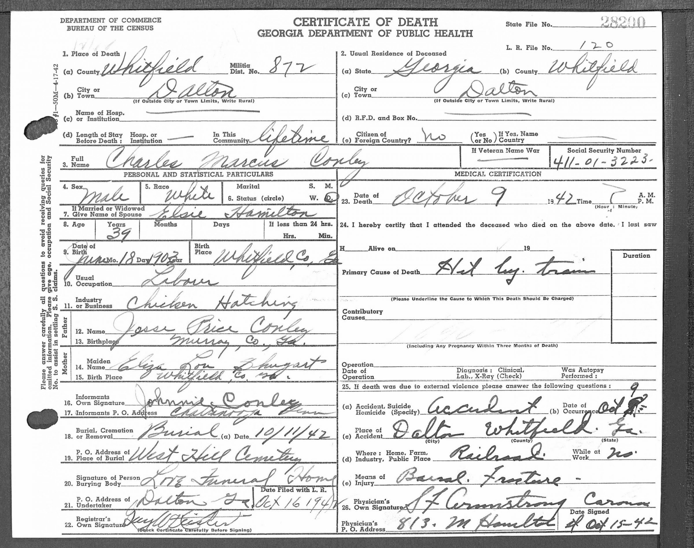 He died on 9 October 1942 when hit by a train at Dalton, Georgia.