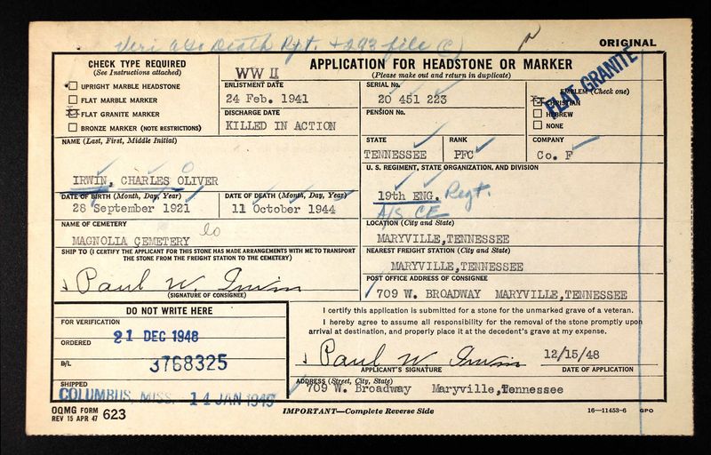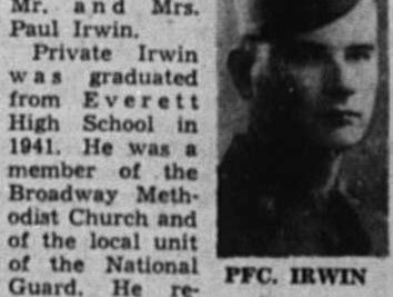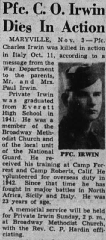 Maryville, Nov. 3 – Pfc. Charles Irwin was killed in action in Italy Oct. 11, according to a message from the War Department to the parents, Mr. and Mrs. Paul Irwin. Private Irwin was graduated from Everett High School in 1941. He was a member of the Broadway Methodist Church and of the local unit of the National Guard. He received his training at Camp Forrest and Camp Roberts, Calif. He volunteered for overseas duty in 1942. Since that time he has fought in major battles in North Africa, Sicily and Italy. He was 23 years of age.